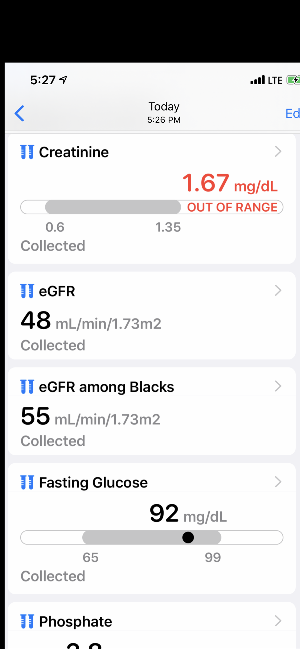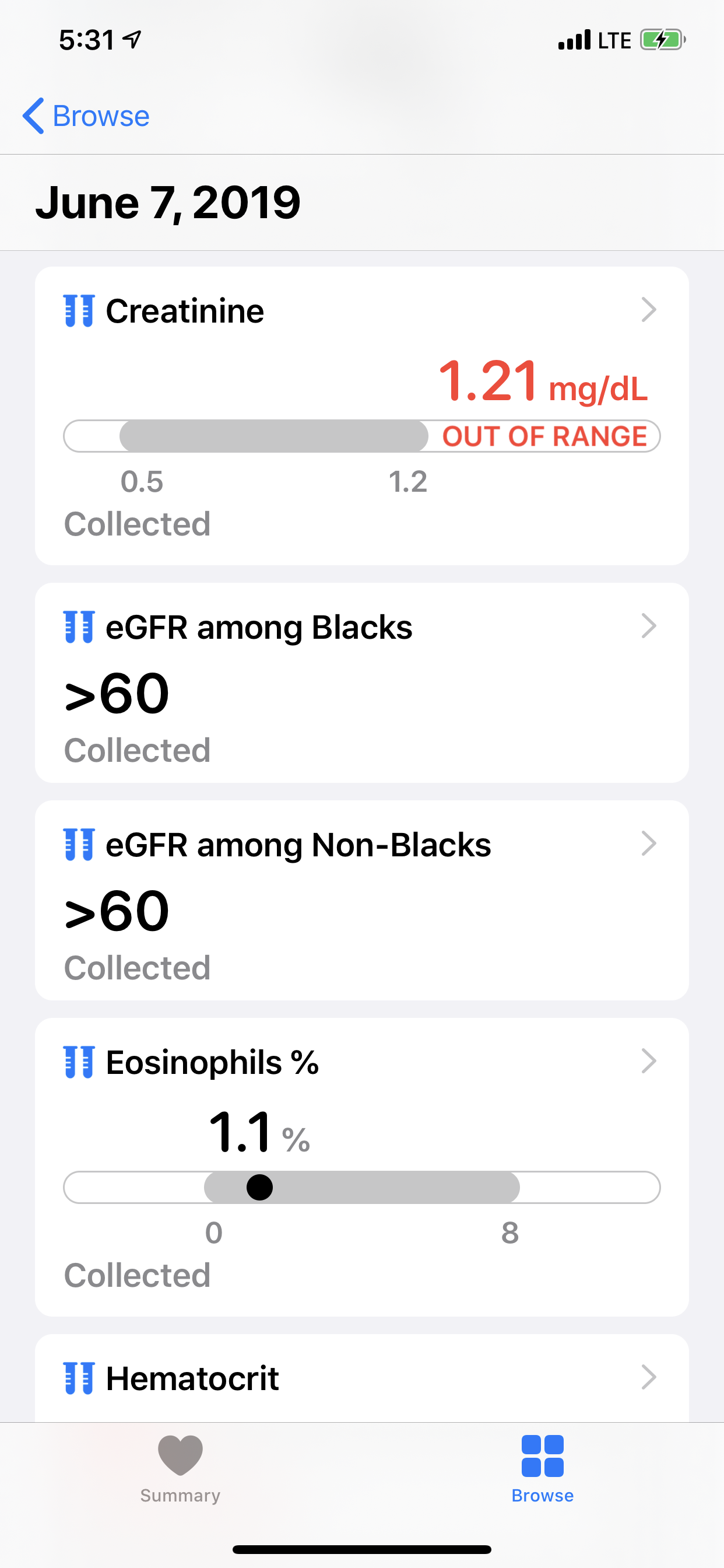 post ios 13 Apple health shows reports from quest diagnostics now has efgr labeled as efgr Blacks snd efgr non African American.