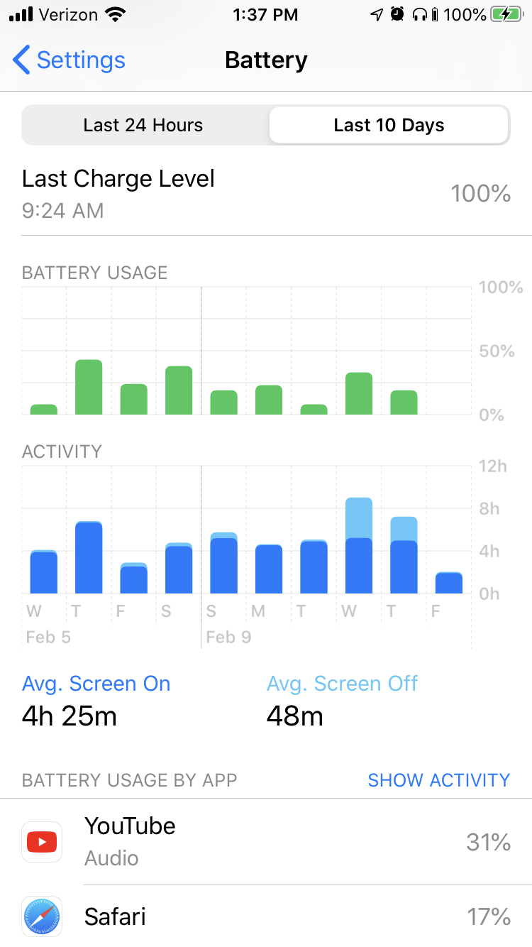 Thank you pal, I see an average of 4 and a half hours of screen-on time, but I suppose that you don’t use 100% of your battery, as your activity shows less than 50% of usage. With iOS 13 is harder to tell how many hours of screen time you’re getting from your last charge (iOS 10 battery graphic was better).