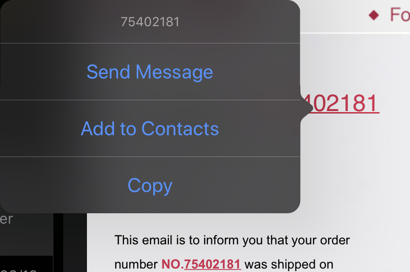 I’m wondering if the format and length of your order number is fooling the system into thinking it’s a phone number? It should be smarter than that and detect the context but it’s not perfect in that regard.