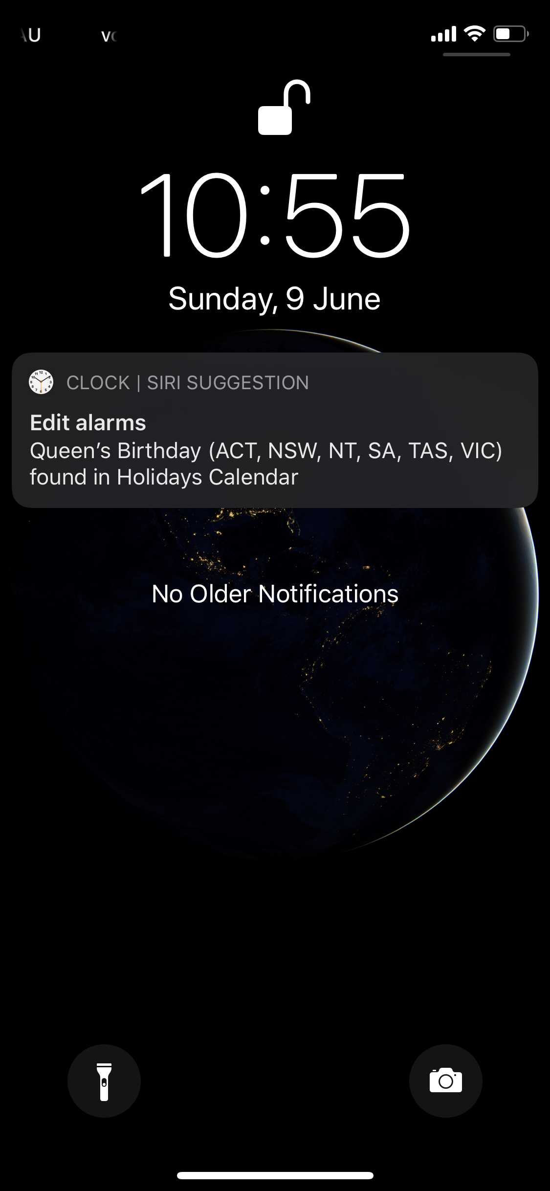 Siri suggestion to edit my alarms because of a public holiday tomorrow. This is cool!