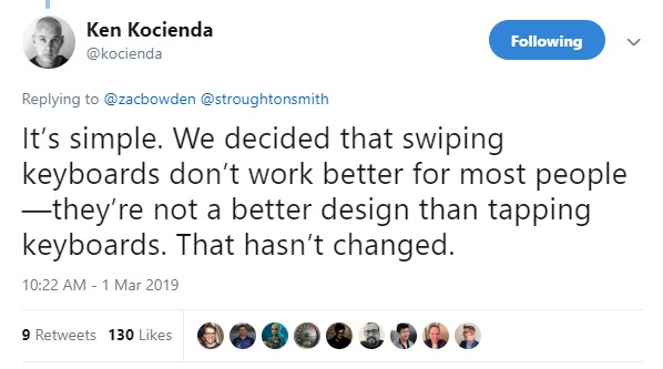 Kocienda did create a great keyboard. 10 years ago. Things have evolved since then and Apple is seriously lagging behind because as I said, why can’t the keyboard support both swiping and tapping? It doesn’t matter much to me though, Apple never has to add swipe functionality really since they started allowing third party keyboards that do it instead.