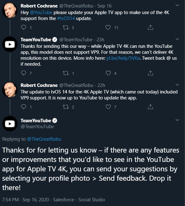 That is some BS right there YoutubeIt's not available on TV 4K yet. YouTube seems to be taking some backlash from users whether if they are aware of the 4K support in tvOS 14. During the beta stages, it was only 4K HDR and then all 4K on mobile. It might be a gradual release for users.
