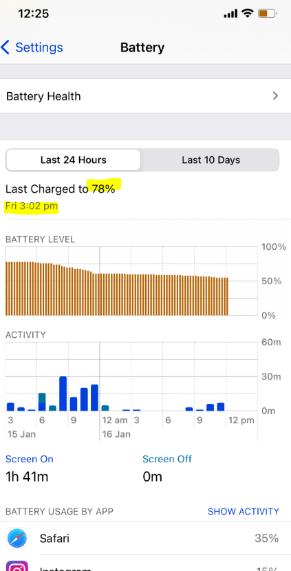 - the phone battery (98% battery health, after resetting down to 96%)