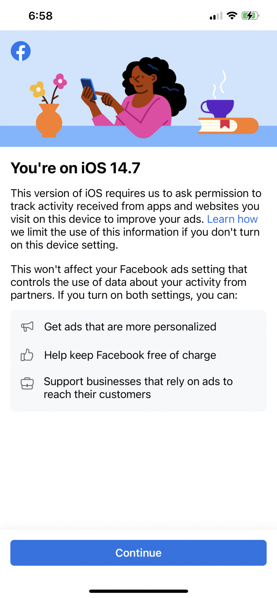 With the ATT setting turned off, you should not see any fancy prompt, or if you do, it will be significantly less. I know that the apps owned by Facebook all have a fancy splash screen. This is just their method of marketing to try to keep users in the allied tracking list.Anyone seen this yet? I turned off the tracking request setting after this so I won’t have to worry about seeing these anymore.