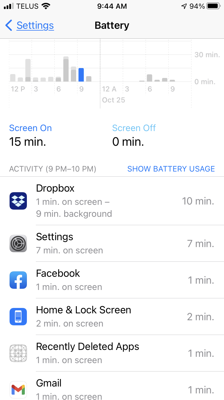 I have an iPhone 8, iOS 14.1 and have been experiencing poor battery life for a while. Fixed it yesterday with one change. Unlinked Dropbox from the iOS Files app. I noticed a conversation on a Dropbox forum that confirmed that the iOS Files and Dropbox interact constantly. When I checked some of my one hour slices (see pic) in Settings/Battery there were long periods of Dropbox background activity Even Though I had background activity turned off in Settings/Background App Refresh and Settings/Dropbox.