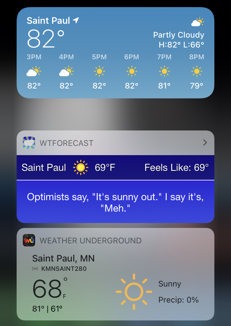 Well, I'm guessing they're pulling from different sources, plus then the weather widget might be behind a little bit too (can't tell for sure, as the clock is cropped out). I see differences in temperature between Dark Sky, Met Office and stock Apple one.