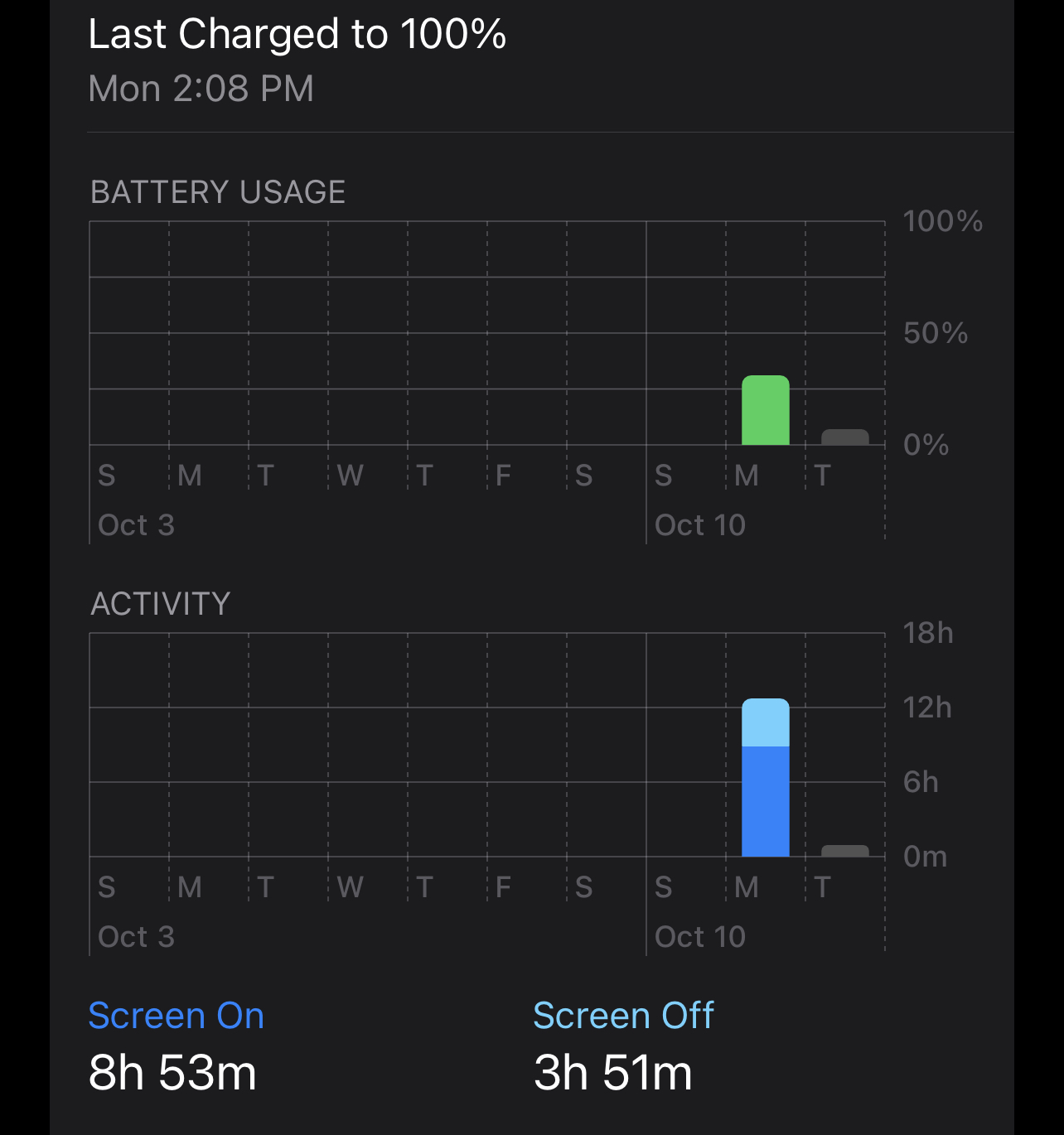 Never thought about using the last 10 days option. I suspect it should work other than the inflated app times someone mentioned in another post. I dont really pay a lot of attention to the battery graph anymore (other than the percentage up top). Just use device and charge when needed.I never charge in the middle of a day, it's always overnight, so when I want to work out the numbers for a single charge I switch the battery graph from "Last 24 Hours" to "Last 10 Days" and then individually select (tap on) the bar for the current day which then, as I understand it, changes the "Screen On" and "Screen Off" totals to being just the data for the calendar day that is selected on the 10 day bar graph.