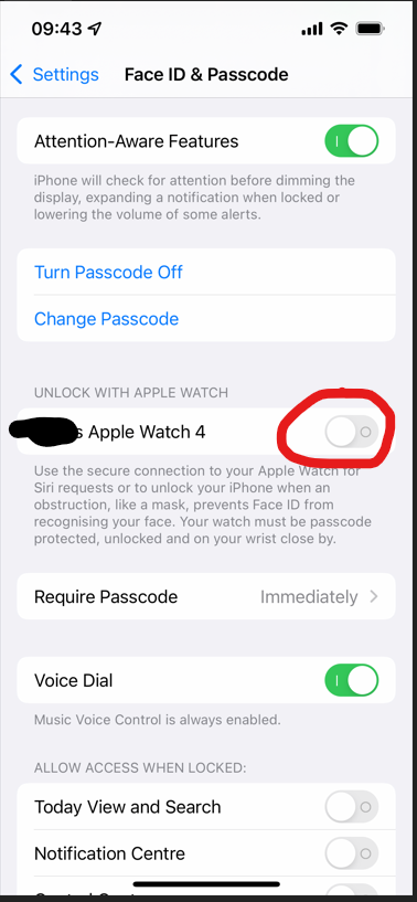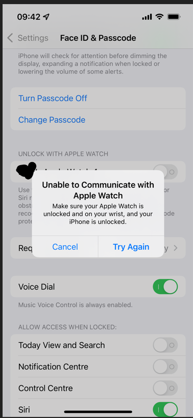 I am trying to turn on 'Unlock with Apple Watch' used for when you are wearing a mask but each time I flick the switch, I just get this error :