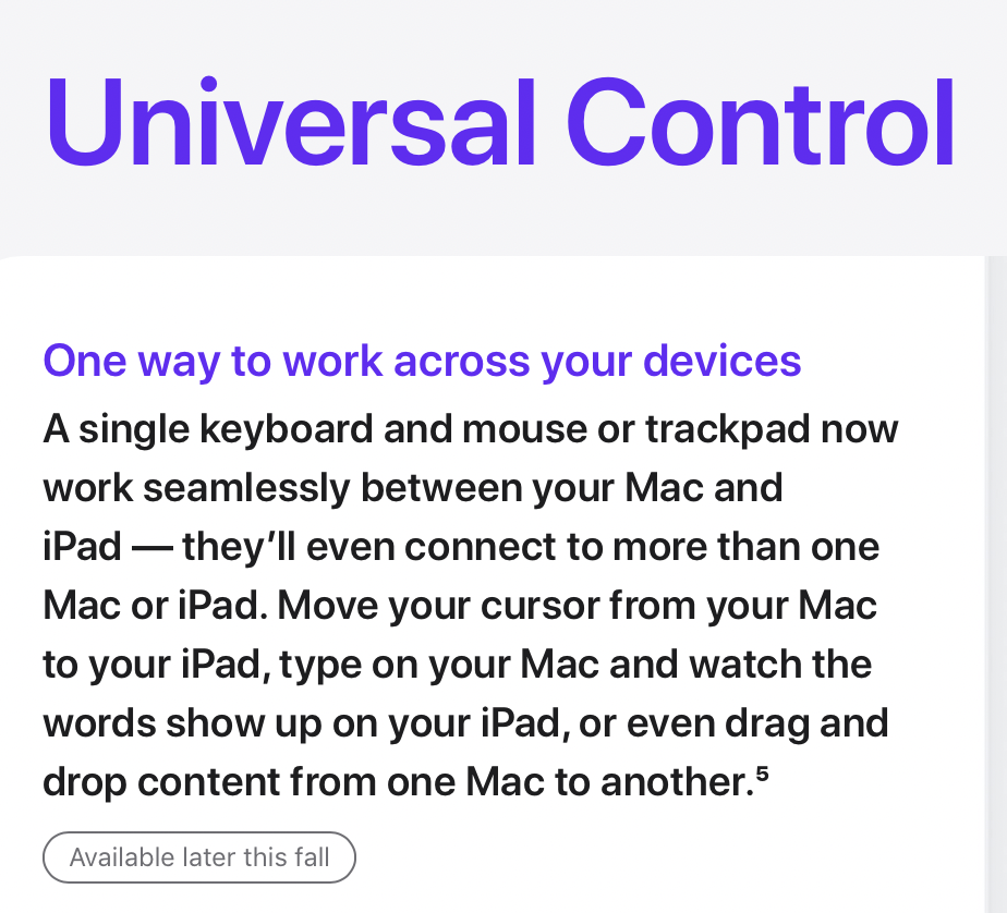 As of right now, every paragraph in the Universal Control section of the macOS Monterey page has a little footnote that says "Available later this fall".Does the feature page still say “this Fall”?
