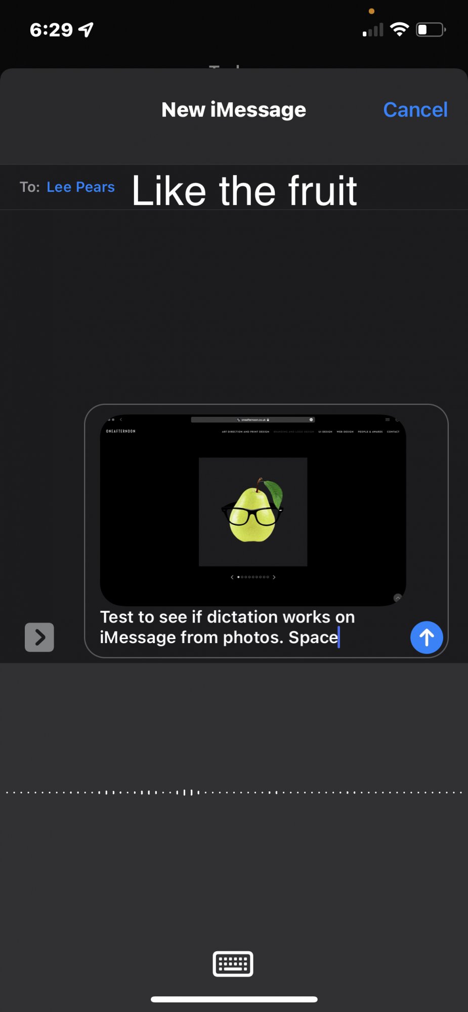 Correct you have to tap underneath or somehow get the cursor under the photo for dictation to complete. I just tried it on my 13Pro Max and the behavior is the same as yours, no beta in use. The bug is that the cursor doesn’t always appear under the photo. The first time I did it as you posted it did not and I ran into the first letter syndrome. Once I got the cursor below, every other time I attempted this whether manually typing in a recipient or picking the suggested one, the cursor immediately went to the correct spot. I tried a couple of others’ phones as well, different models, no betas, and they all behaved the same. The initial attempt didn’t work properly, all subsequent ones behaved correctly.Anyway.... if I tap directly underneath the photo, all dictated text displays right away. So not a bug but instead poor GUI design?