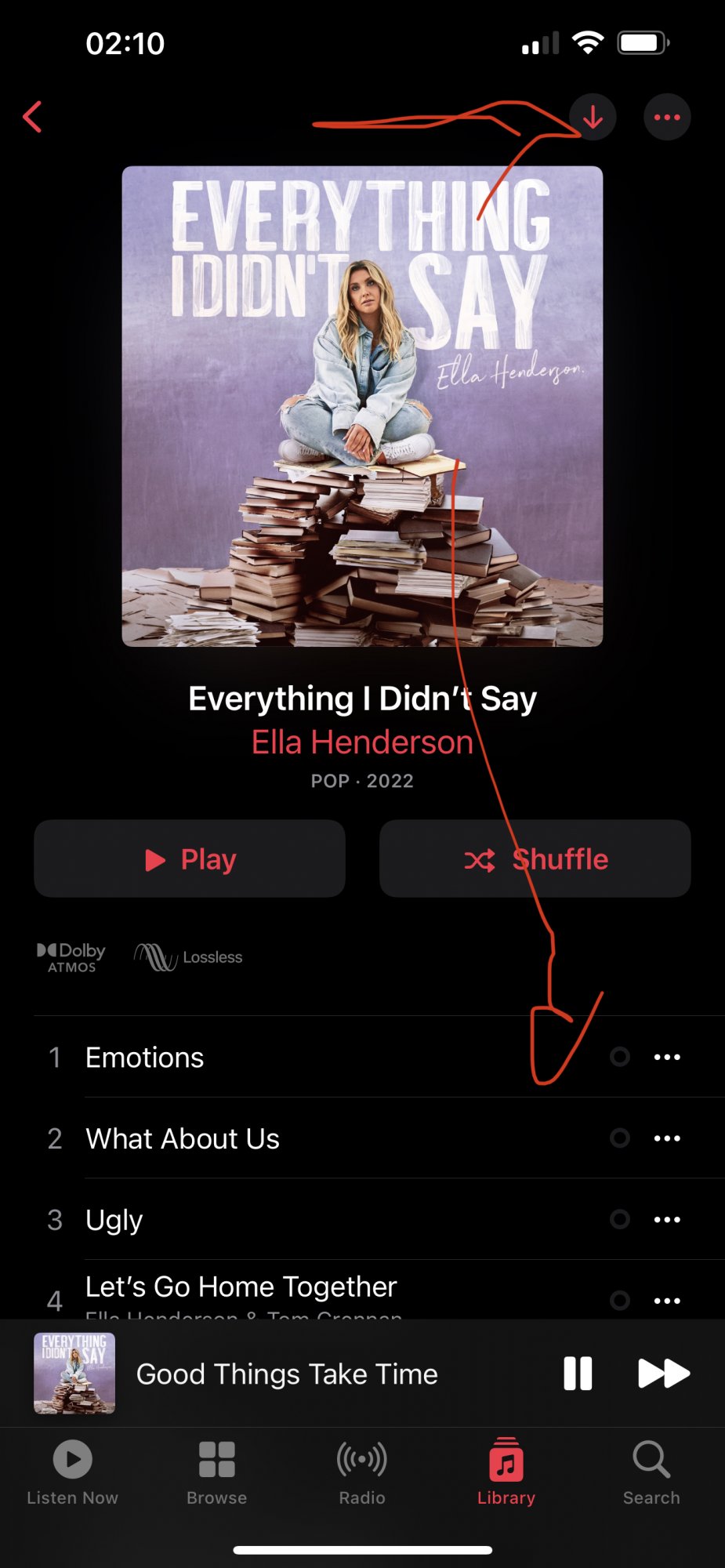 The download arrow at the top should be a downloading indicator (as the whole album is being downloaded), similar to the ones that appear next to each song.What is the bug exactly?
