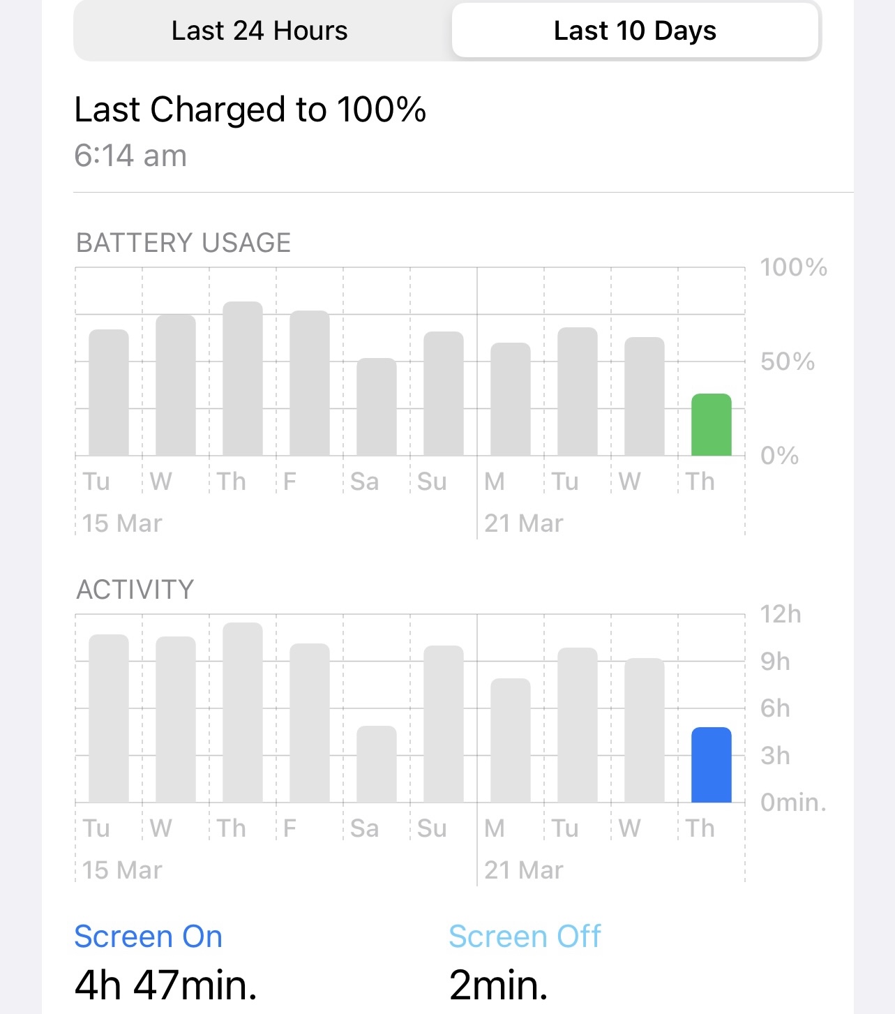 The issue with the 10 day chart is it includes the time you weee charging your phone. It can give a skewed view of your battery life.