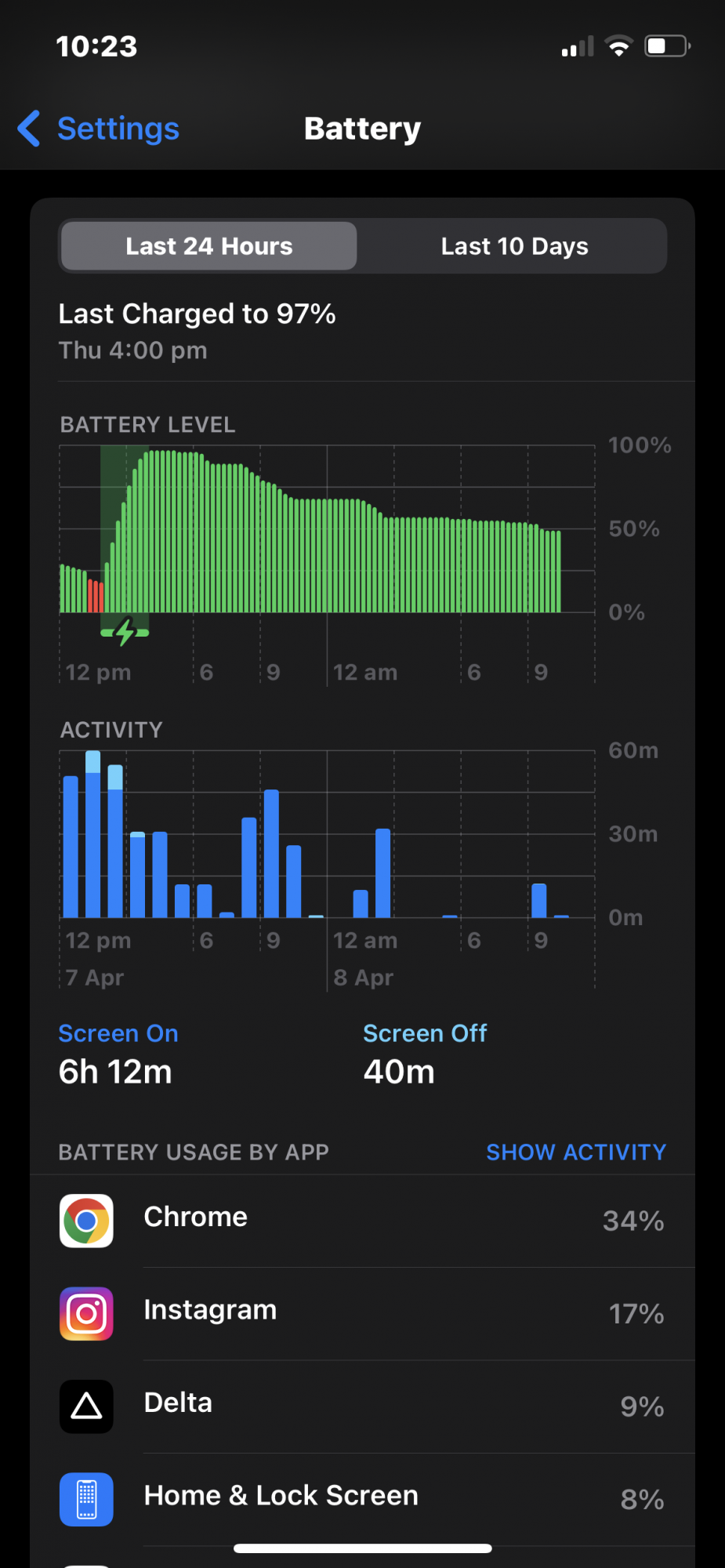 Last charge was 4pm yesterday. I only charge once a day once I hit red. 48% left with 6hrs screen on, ain’t bad. It’s normally around 30% left 5hrs.