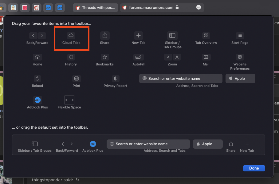 Ah...that's the Mac Safari toolbar settings. I thought it was iPadOSEither View -> Customise Toolbar or right click on the tool bar and select Customise Toolbar.