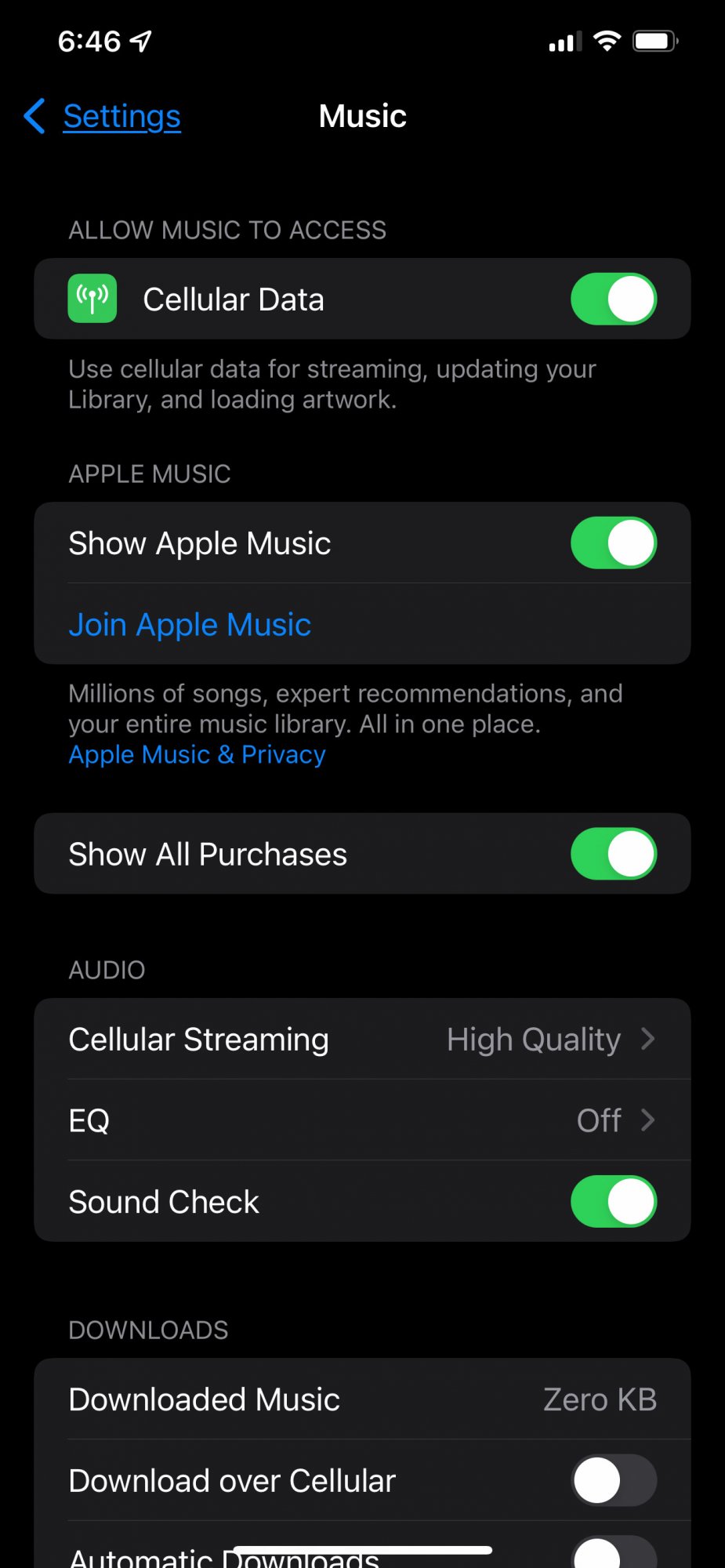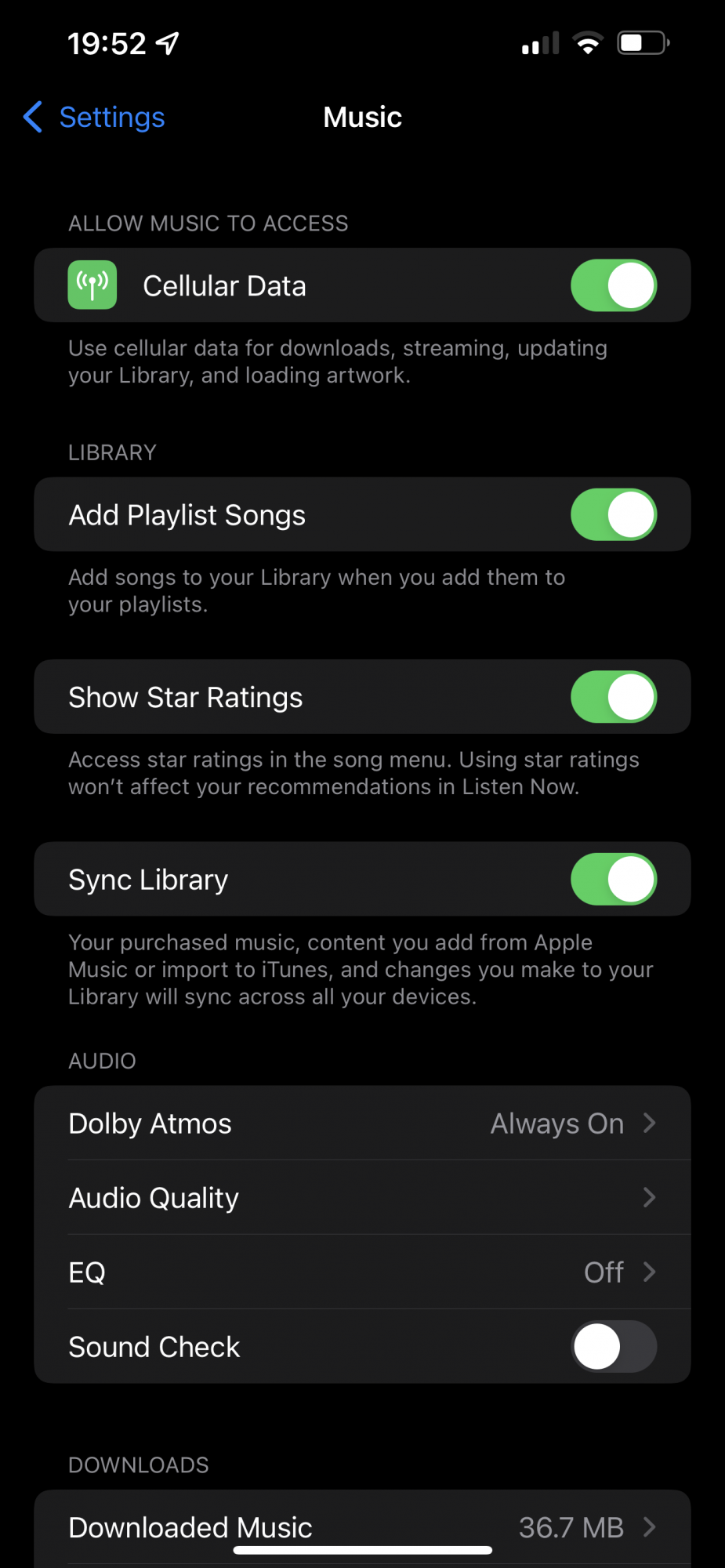 I am not using Apple Music... Spotify, Sirius XM and iHeartRadio... don't see any Settings > Music anything...