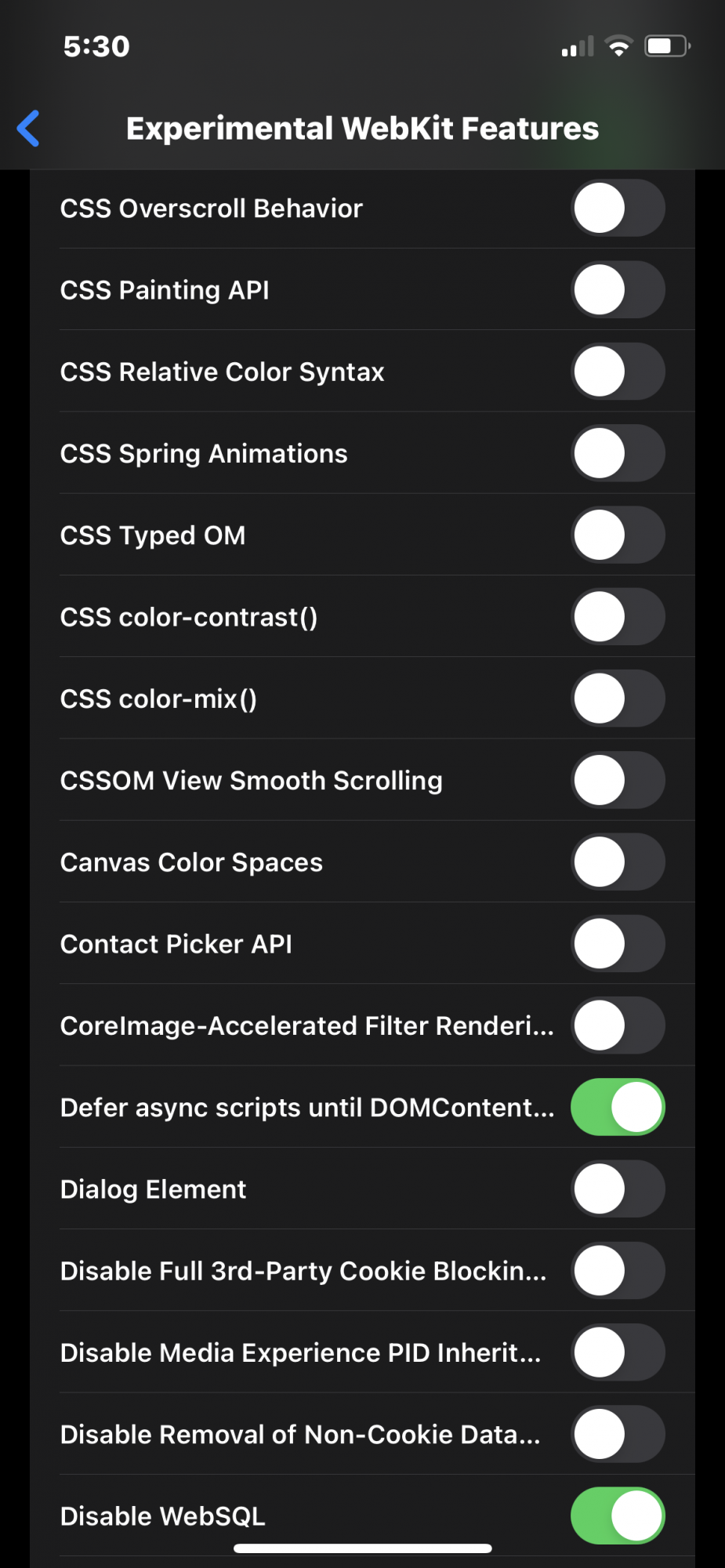 I think it will be easier if I posted which line items are set to ON and that will tell you that the rest of the line items are OFF. Below is the list of line items that are ON by default -Can any kind soul take a screenshot of their Safari Experimental Webkit Features page? I was messing around with it and now every webpage I attempt to load has a bunch of "???Y@K?12." I need the default settings por favor