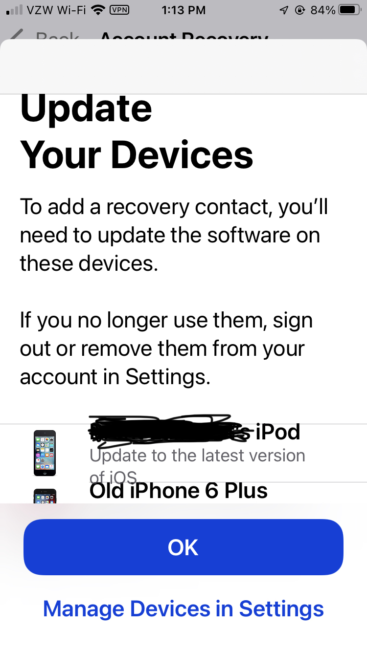 Note: To set up the recovery contact feature, all of the iOS devices associated with your account must be upgraded to iOS 15 or iPadOS 15 or later. Apple Watches must be upgraded to watchOS 8 or later. You will not be able to use the recovery contact feature until you upgrade all of your devices or remove them from your Apple ID account.