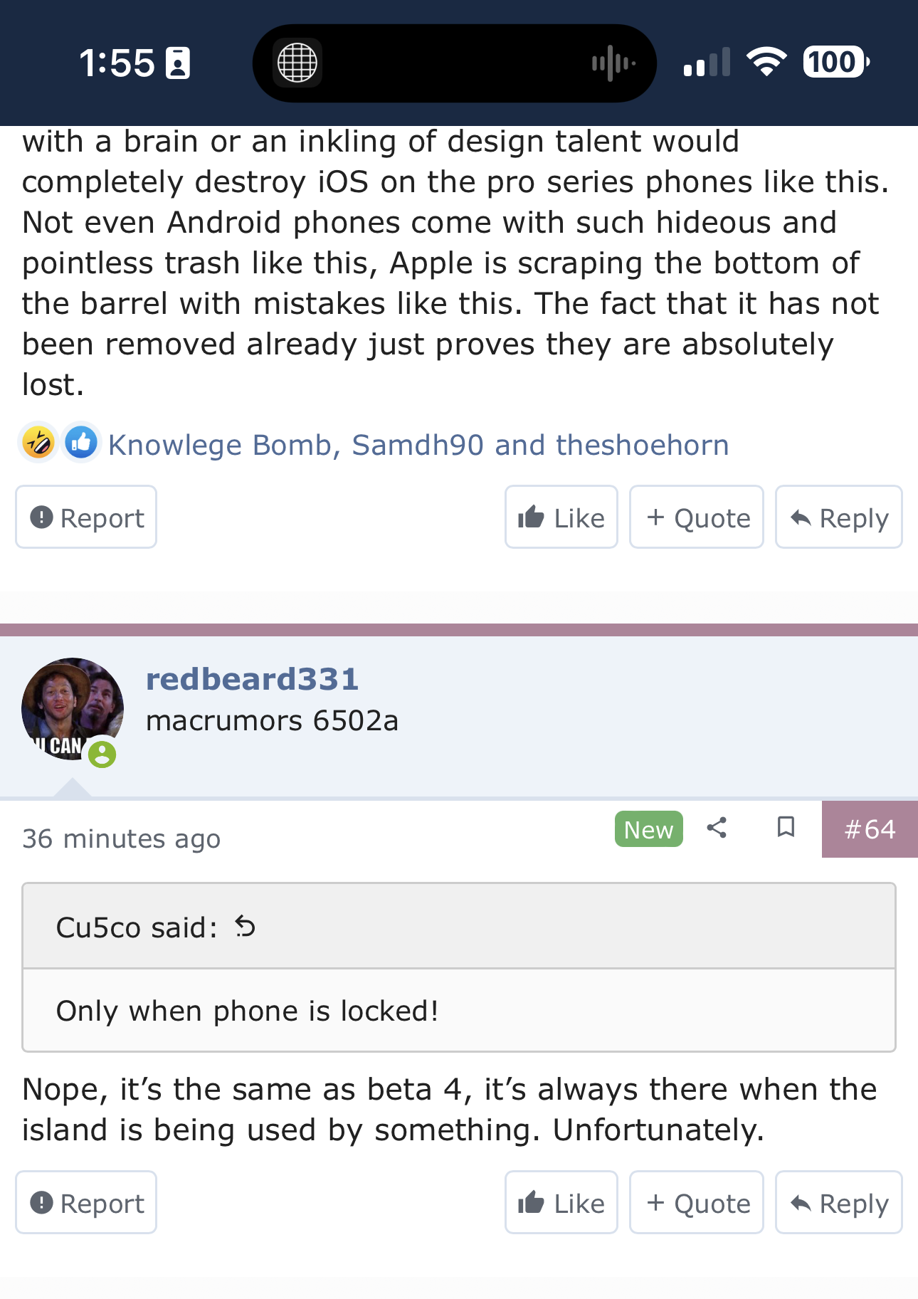 But what you’re missing is that it was so faint it was imperceptible most of the time, why do you think it got so much negative attention when beta 4 dropped last week? It was NOT like it is now where it’s this bright garish looking outline that’s there most of the time. And for some reason when you visit macrumors it goes away, maybe they did something to disable it since it’s so hideous? Try going to a site like 500px, and see how bad it is. It also changes color depending on what is using it so if the app icon is the same color as the area around the island you’re not going to notice it as much.
