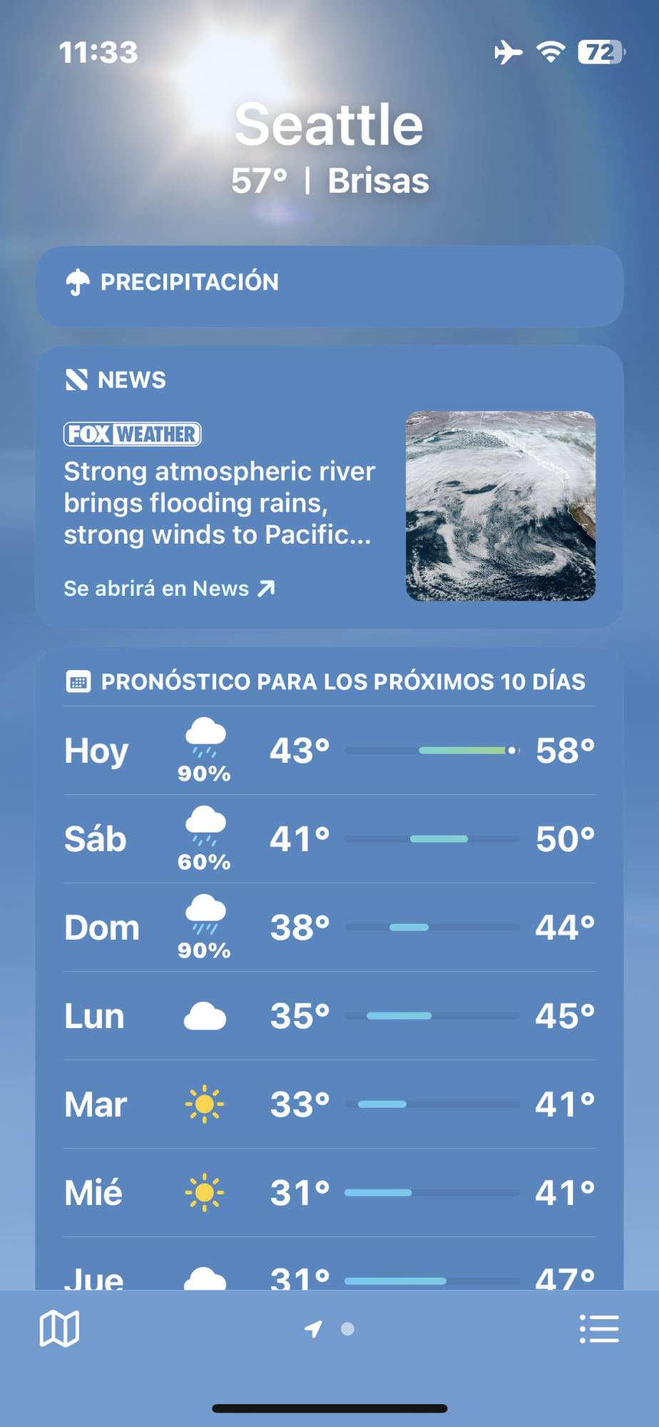 Lots of rain in the forecast, but the couple of sun glyphs I did see in the hourly were normal/yellow in light modeDoes the hourly weather still show the sun as brown when in light mode?