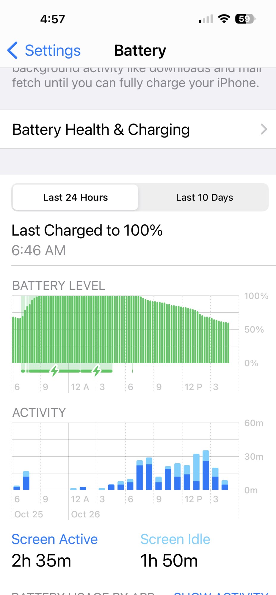 Apps used safari, settings, YouTube, insta, camera. Brightness set at 45%. No AOD for now.