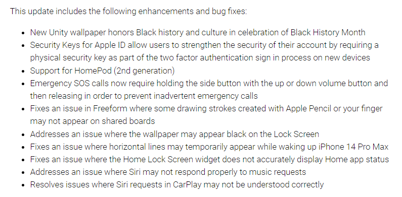 This update introduces a new Unity wallpaper to honor Black history and culture in celebration of Black History Month, Security Keys for Apple ID, and includes other enhancements, bug fixes, and security updates for your iPhone.