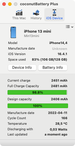 My launch day 14 Pro Max started at 4500 mAh and is currently at 4361, above the design capacity of 4323. 206 cycles, primarily MagSafe charging, and I don't care much about the battery percentage except for having a hard stop at 20% before I start charging. I don't worry too much about this and after 7 months, I'm still over 100% (relative to design capacity).Not quite. Apple doesn't report battery levels or battery health in detail in its GUI, those are just general (cheerful) figures. For instance, I have a 13 mini, which after 166 load cycles is still well above even its design capacity, see attached screenshot from coconutBattery Plus. Mainly because I have charged it between 20 and 80 percent only. Such a regime greatly improves battery performance overall. But the fact that the battery's full charge capacity is above its design capacity is just down to luck, not one battery is chemically identical to another. Now, please don't second guess coconutBattery's stats, they are legit (the app uses iOS's own internal measurements).