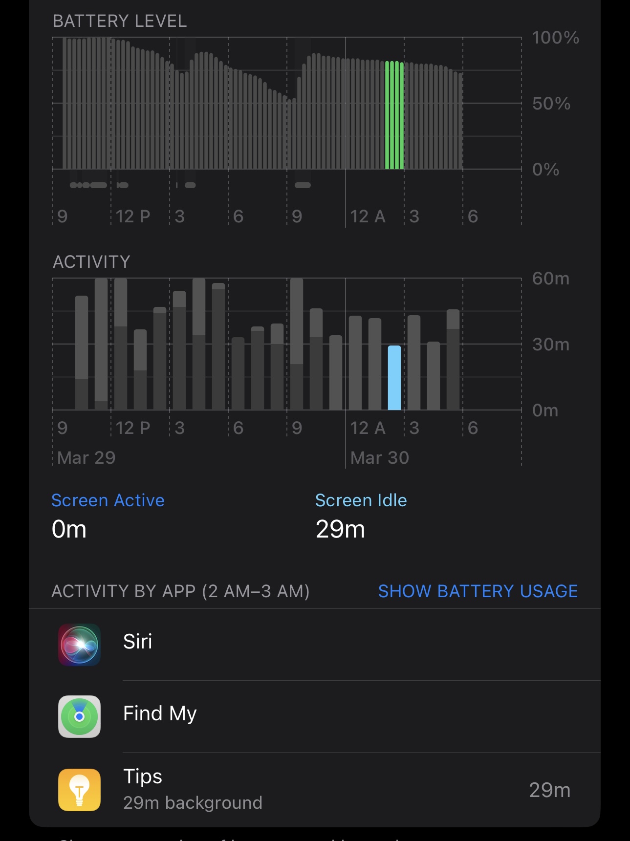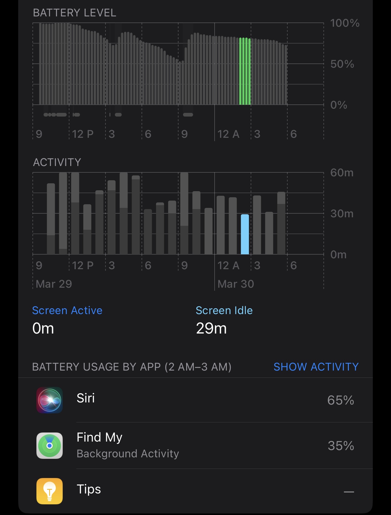 Also, battery life has been great! Still running off the initial install and pulling it from the charger before bed, I’ve still got 75% in the morning. And I watched some YouTube and played a game for a bit, too. It’s weird that Siri and the Tips app even are showing up here, though…