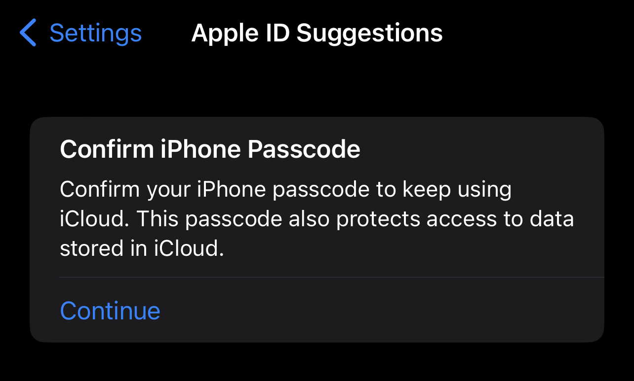 Confirm your iPhone passcode to keep using iCloud. This passcode also protects access to data stored in iCloud"