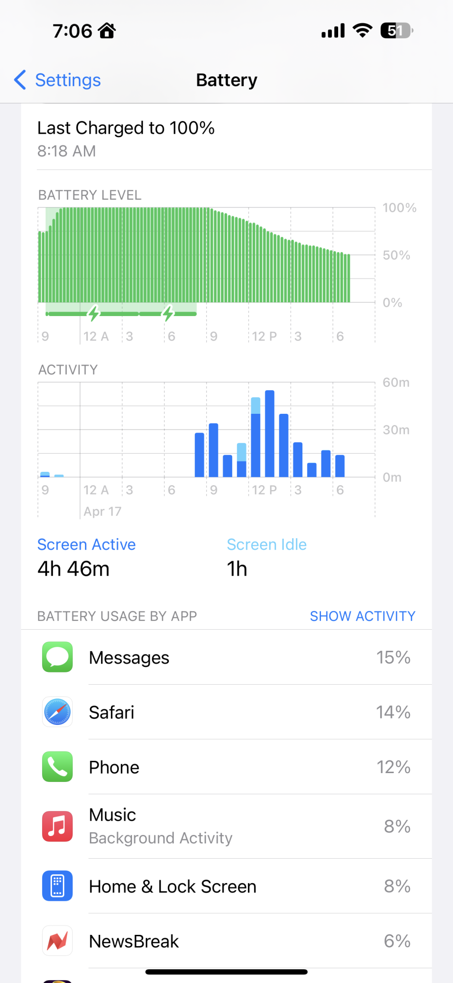 My iPhone doesn’t like me today 😫Battery life has been horrible and has tanked today. It’s only 1:28 PM and I’m down to 31% already. iPhone is still running very hot. Had to turn it off to cool down and turn it back on. Looks like Safari and no cellular signal have killed the battery today.