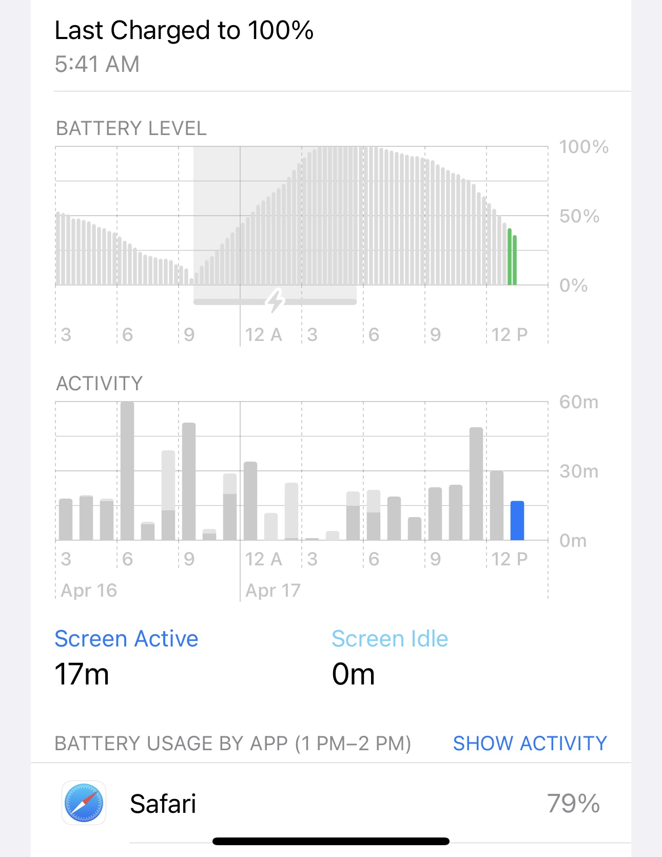 Update on the battery life today. Today is a new day and I’m shocked and surprised by the amazing battery life. It’s 3:54 PM… still have 74% left with 3+ hours of on-screen time. The only difference is I didn’t use my iPhone as much as I did yesterday.Battery life has been horrible and has tanked today. It’s only 1:28 PM and I’m down to 31% already. iPhone is still running very hot. Had to turn it off to cool down and turn it back on. Looks like Safari and no cellular signal have killed the battery today.
