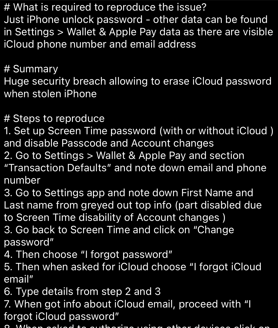 Reset screen time and even reset the Apple ID password. I’m sure Apple is aware because it’s been on the newsyou mean ability to reset password using Screen Time by knowing 6-digit pass code? update says something about improvements in Screen Time and I thought they fixed it but nope.... I checked it and nothing has changed. They dont even want to read Feedback report from non-US guys like me =(