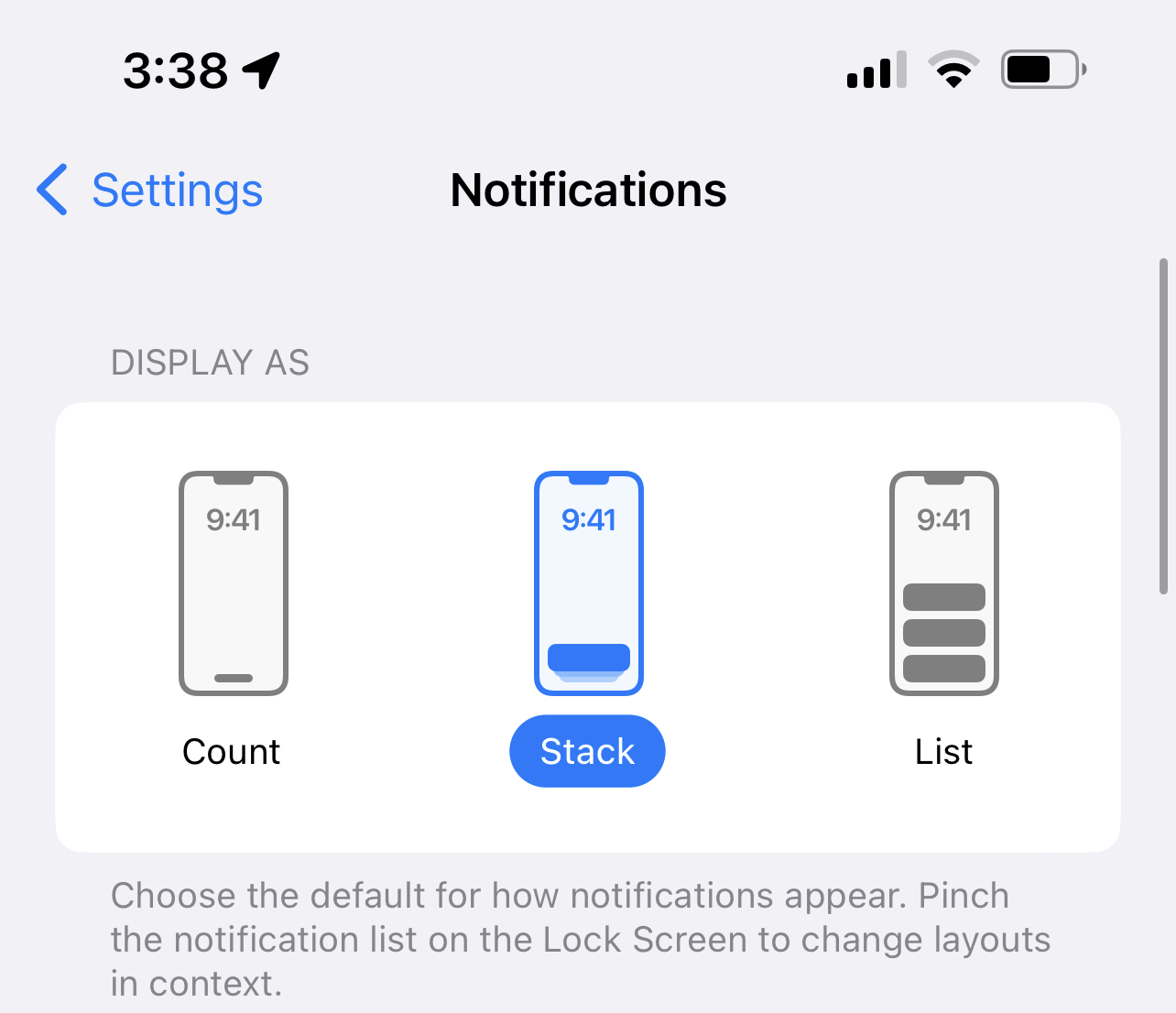 Under notifications, new setting to display notifications on Lock Screen with subtext of "Pinch the notification list on the Lock Screen to change layouts in context"