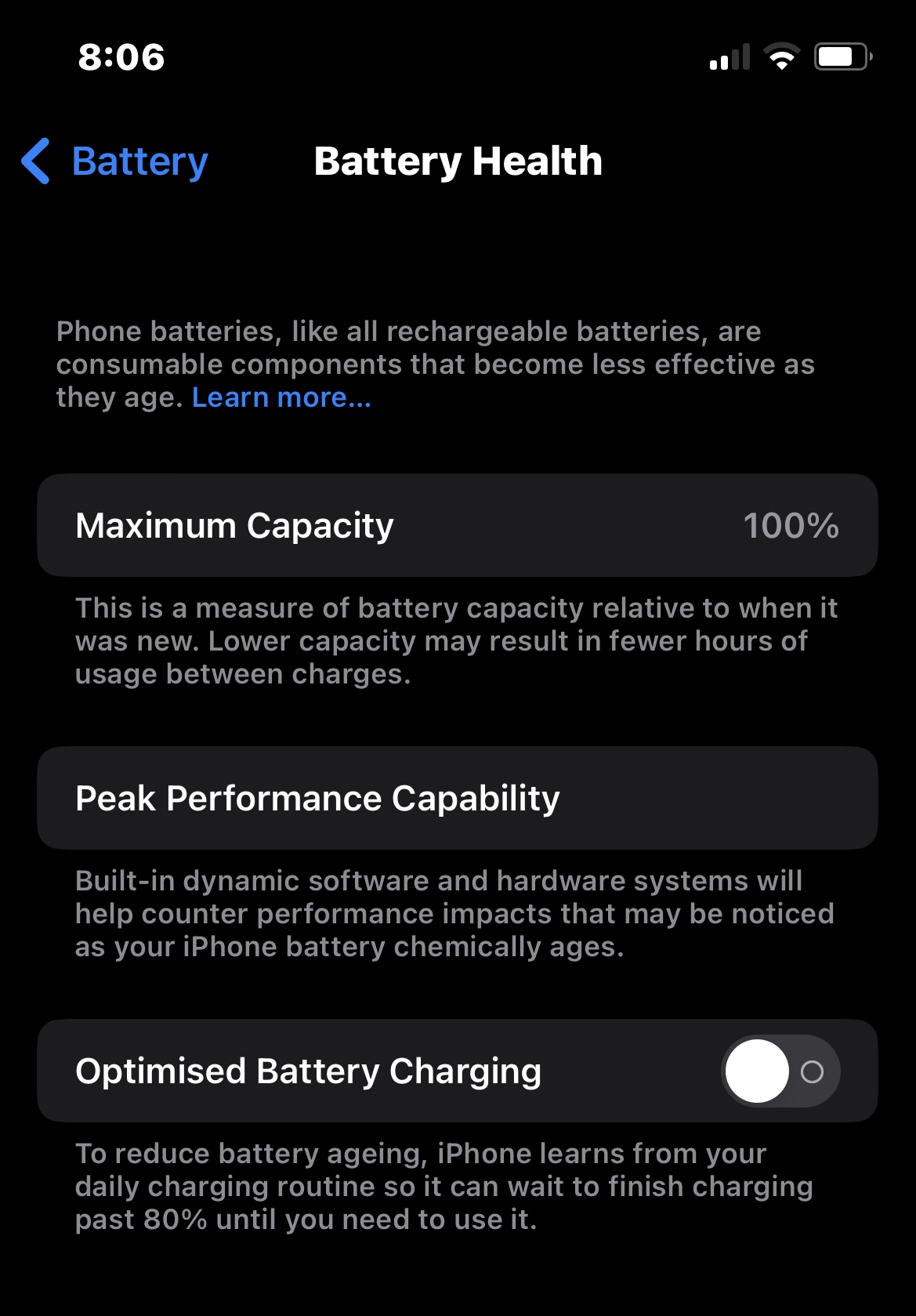 I then set up an alarm/shortcut which, when I charged my phone once a day and it hit 100%, I unplugged it. I’ve stopped using wireless charging pads and charging all through the night. If my phone drops in the day to 30% I charge it up as and when I need it, keeping the drain out of the red.