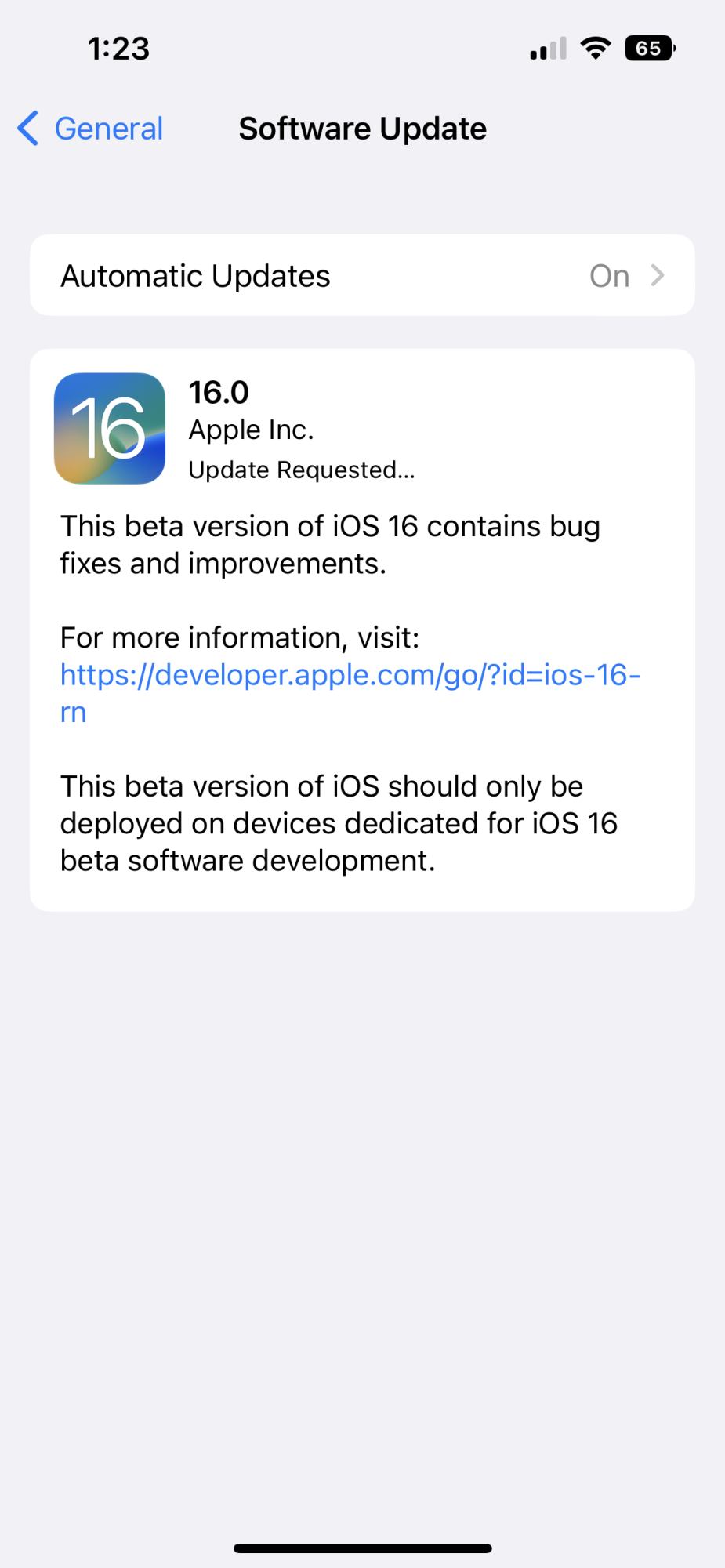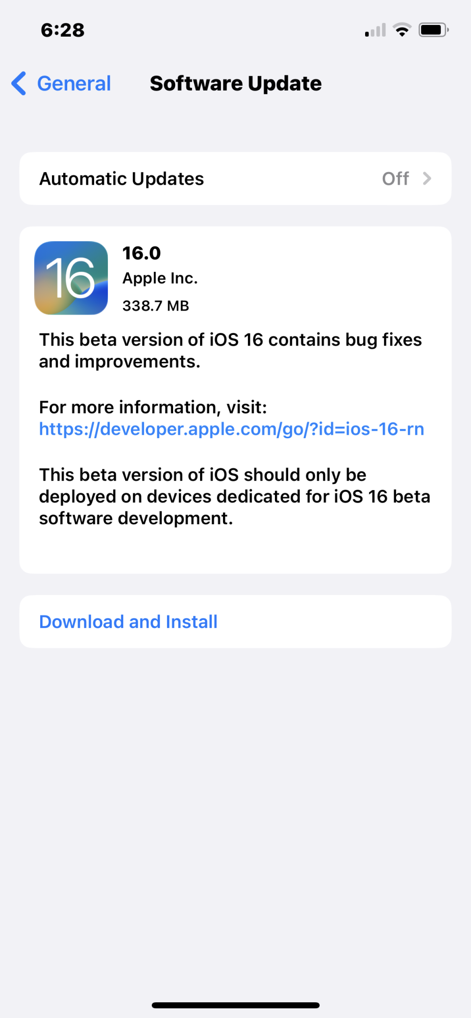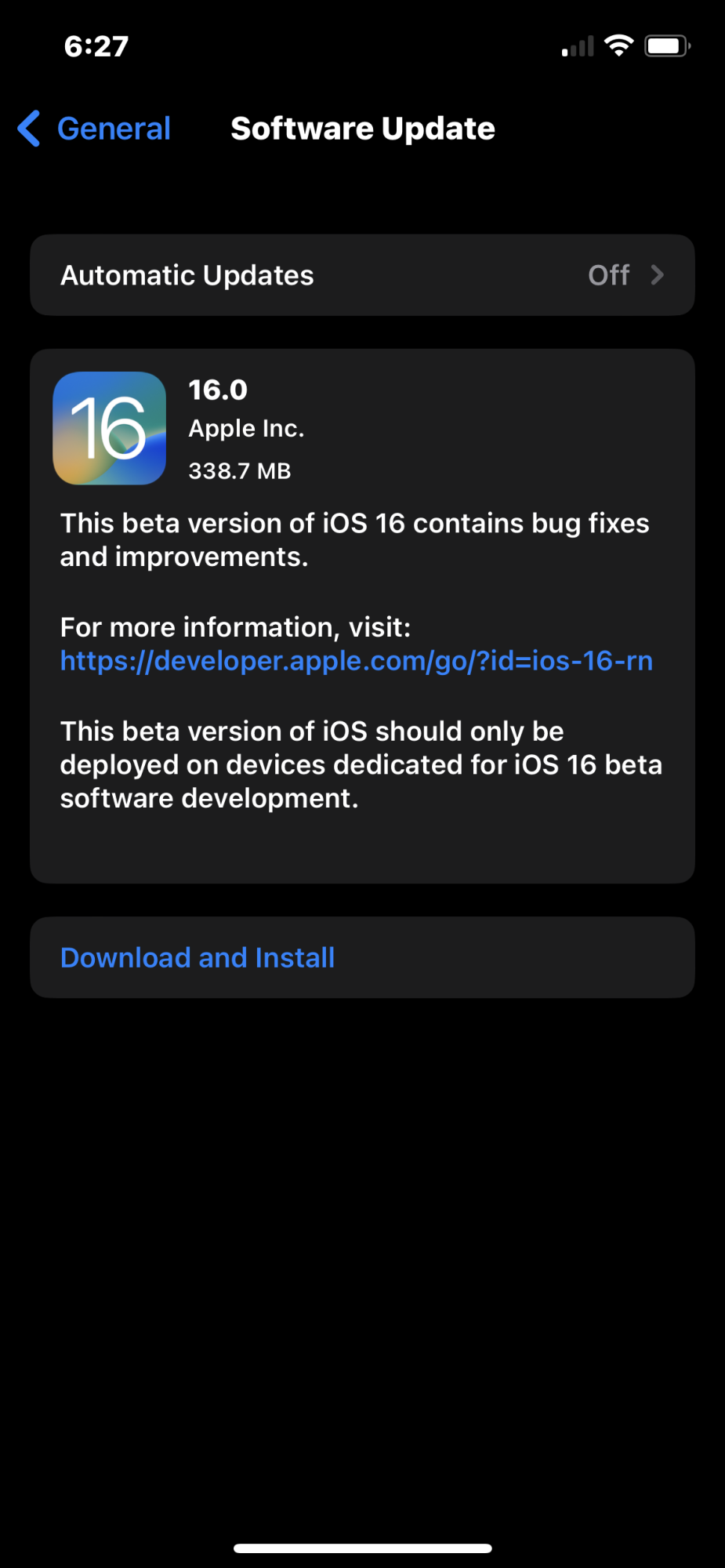 Oddly enough, on my phone, it showed up as just iOS 16.0 (without any beta terminology), so if I were a betting man, I'd say this is the version that's being loaded onto the new iPhones in production right now. That and it's also an "a" build. Obviously it says "beta" in the text description, but I think it would usually show "Beta 7" to the right of "16.0"?