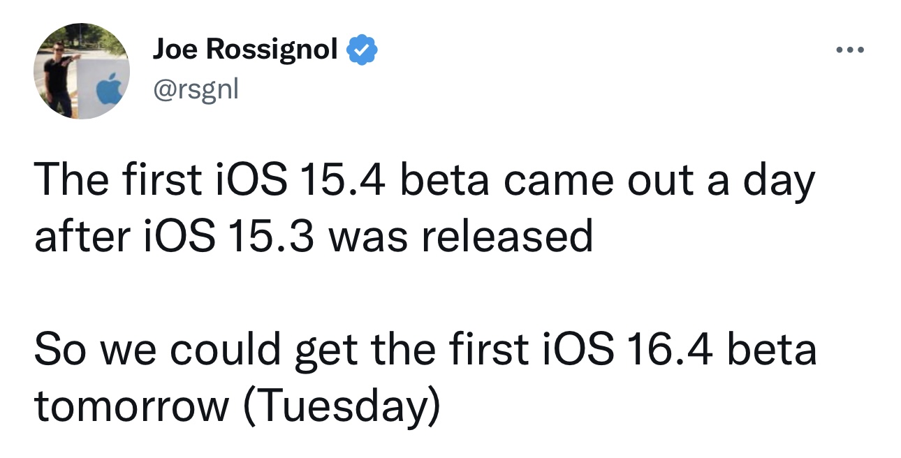 Being released in mid-March is different than we won't see it as a beta sometime this week.I agree. I don't expect iOS 16.4 to be released until Mid-March. It will follow up with Apple's Spring Event in March of 2023. Hopefully, it's packed with new features and some serious bug fixes. Knock on wood! ✊