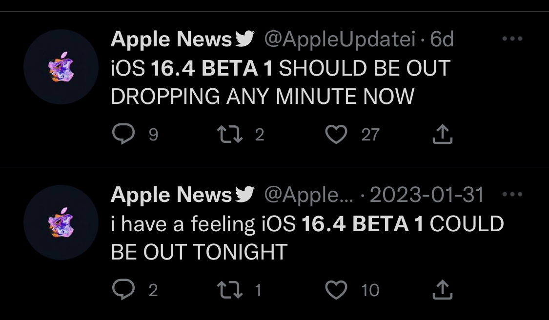 To me 16.4 not being out is an issue. I just remembered a few months ago we had a TV/homepod release for a .1 update but no IOS, I won't be surprised if they follow in the same footstepsTo the contrary, the fact that there was a 16.3.1 for the HomePod and Apple TV tells us there will be one. The question is why did they release those other ones yesterday and why didn’t they (as of 1:12pm on Tuesday) release 16.3.1 for iOS and iPadOS?