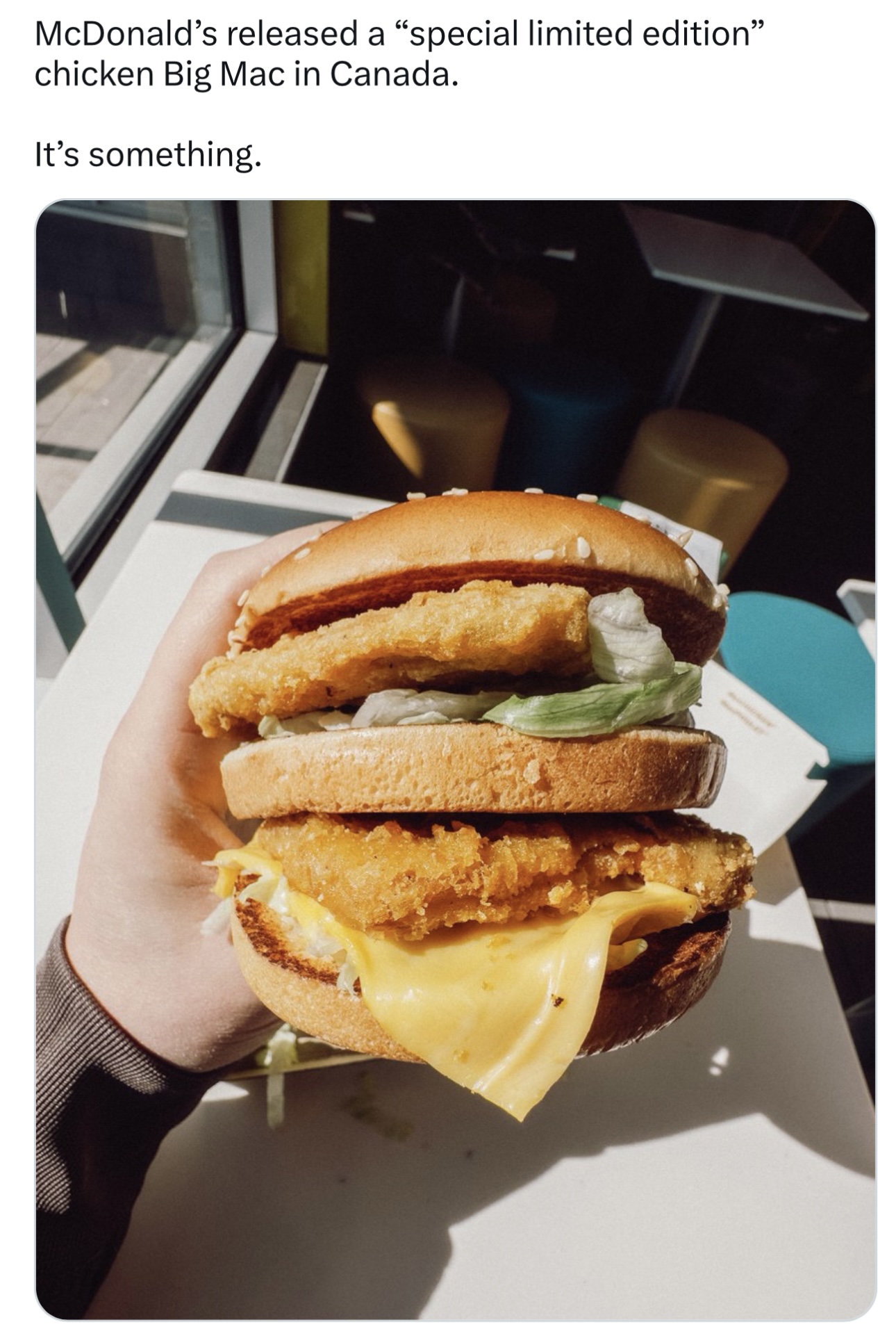 At last, I have settled. I only want a "special limited edition", chicken Big Mac 🇨🇦. Will you go get it for me, please? Don't forget the extra 🥬 lettuce