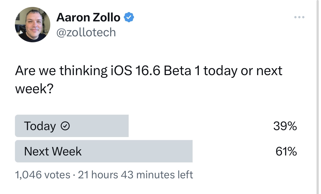 Place your bets!Not tomorrow! I have a feeling iOS 16.6 Beta 1 is coming on Tuesday.
