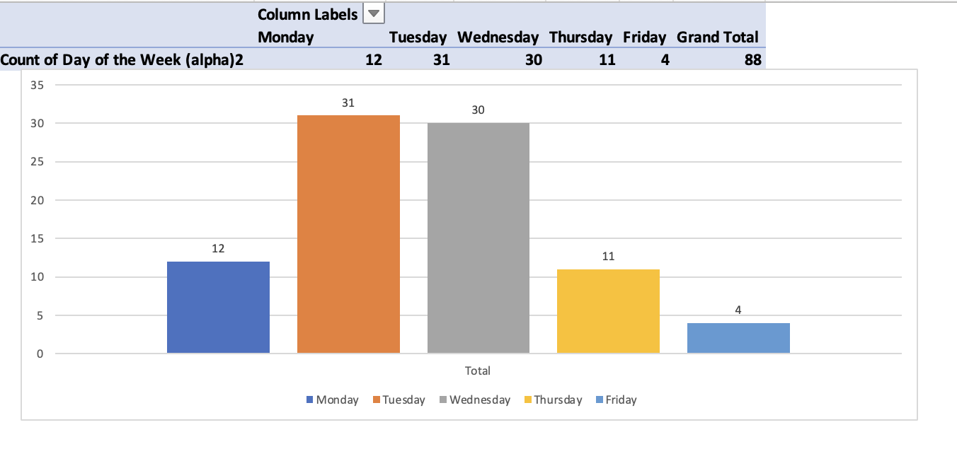 I thought I would present my initial findings relating to the distribution of the days of the week that releases are made. As suspected, Tuesday is (by a slim margin over Wednesday) the most popular release date.