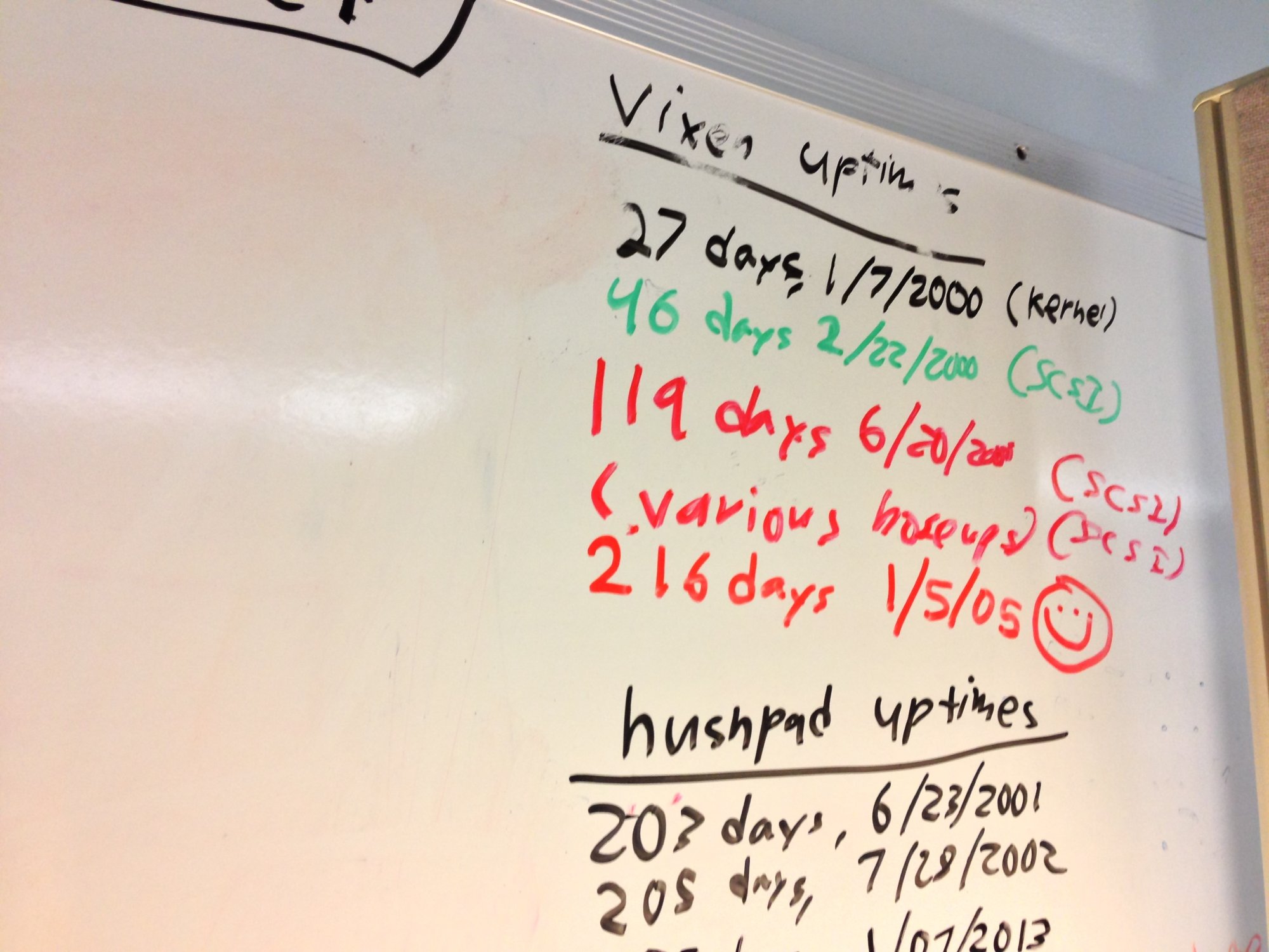 You remind me of myself 20 years ago, when I used to keep uptime records for machines at work written on a whiteboard. I still have a photo from back then.