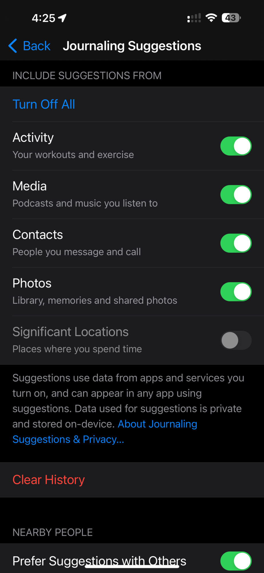 Take a look at your “Journaling Suggestions “ settings under Privacy. Looks like having Significant Locations enabled could open up more suggestions..Haha I thought it would ask for your mood throughout the day and then use your selection with AI to make automatic suggestions to improve your health or something like that.