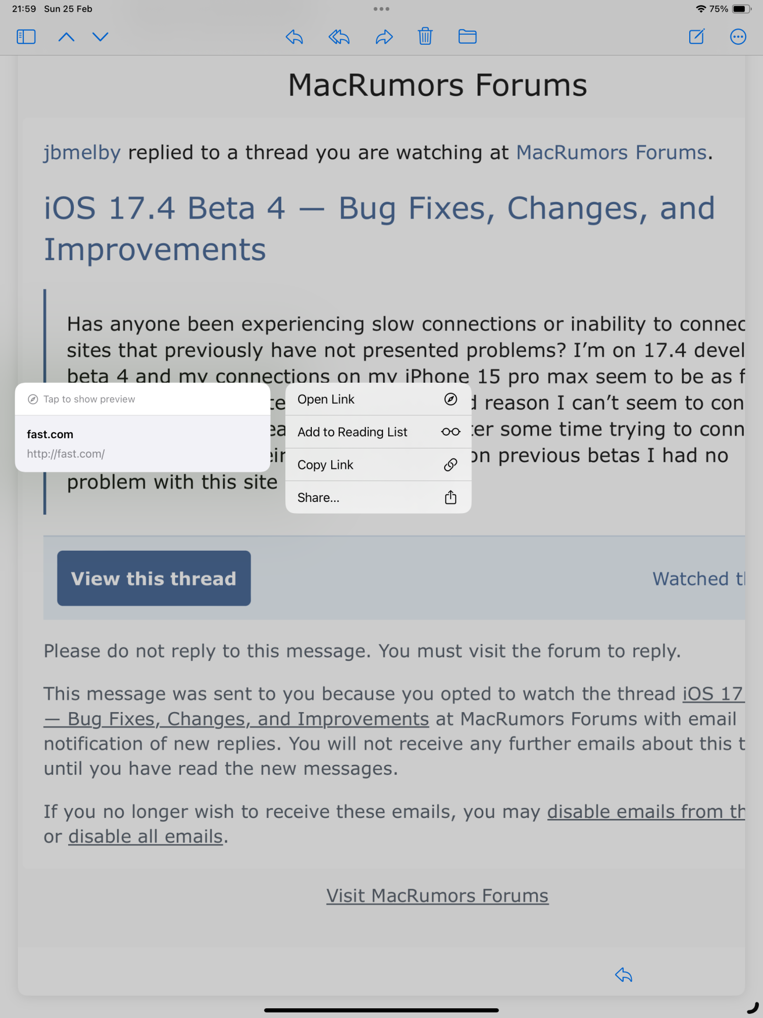 Has anyone been experiencing slow connections or inability to connect on sites that previously have not presented problems? I’m on 17.4 developer beta 4 and my connections on my iPhone 15 pro max seem to be as fast as ever, as far as I can tell, but for some odd reason I can’t seem to connect to fast.com, but instead get messages after some time trying to connect that I can’t reach their servers, whereas on previous betas I had no problem with this site at all. Very odd.