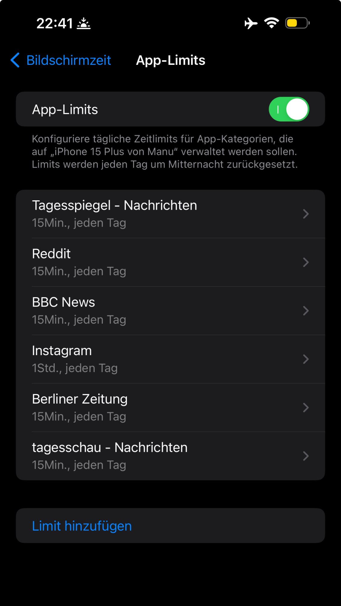 Screentime limitations dont seem to work on Apps for me. I am kind of addicted to news, so I set a limit of 15 mins for each App, but it’s not kicking in.