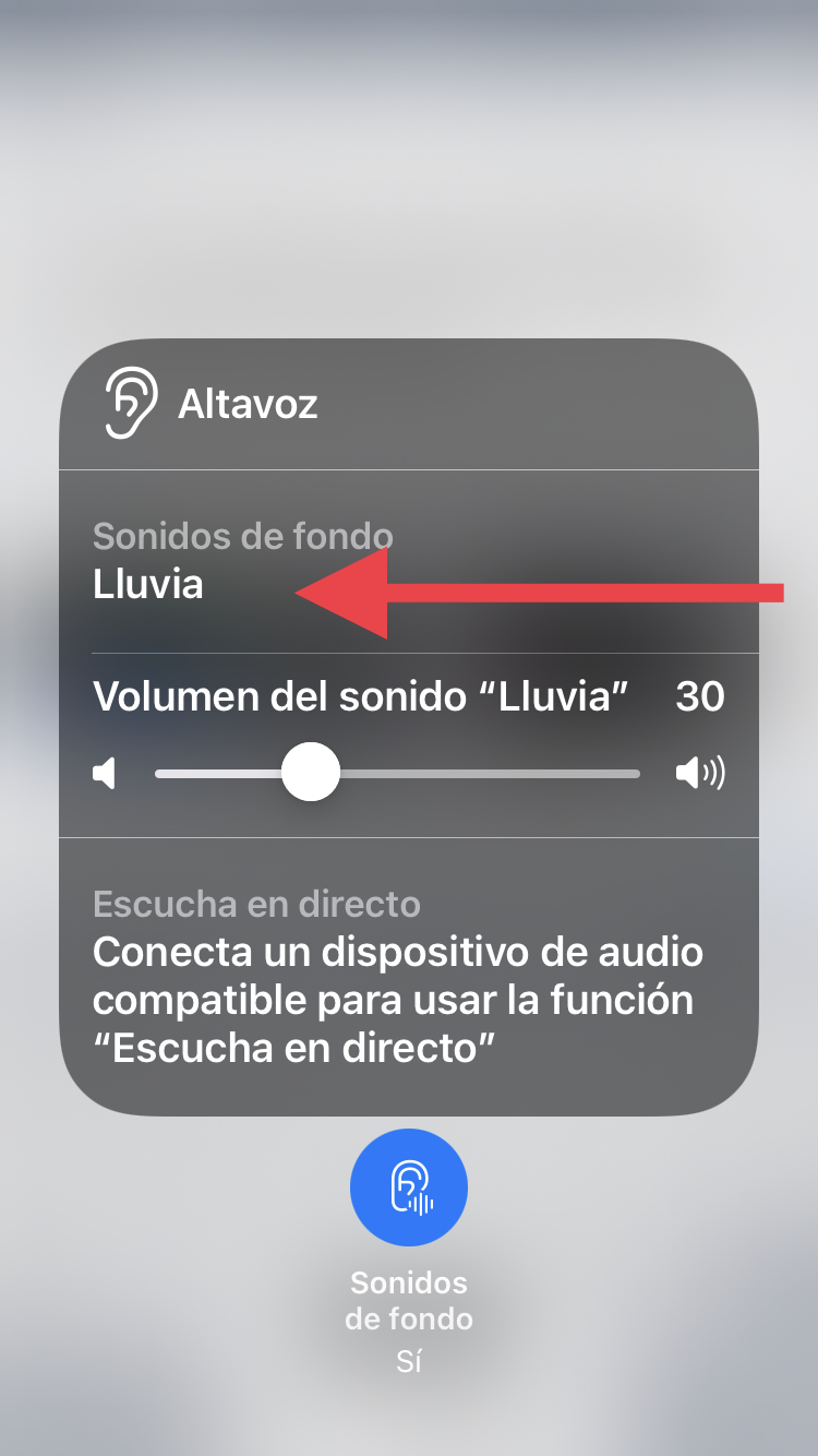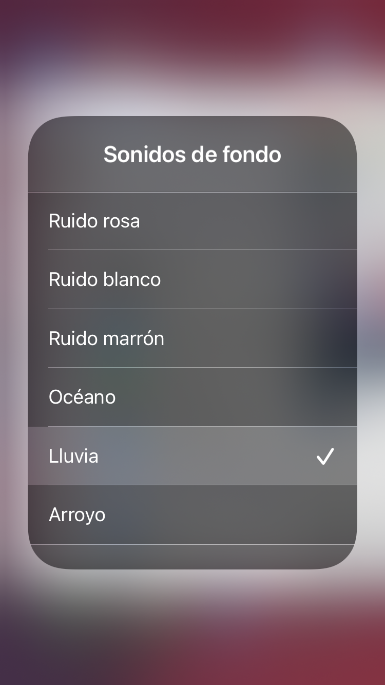 Then, after tapping on the sound (red arrow), you can see this menu where you can choose from, at least on iOS 15, 6 different sounds: pink noise, white noise, brown noise, ocean, rain and river (see screenshot below):