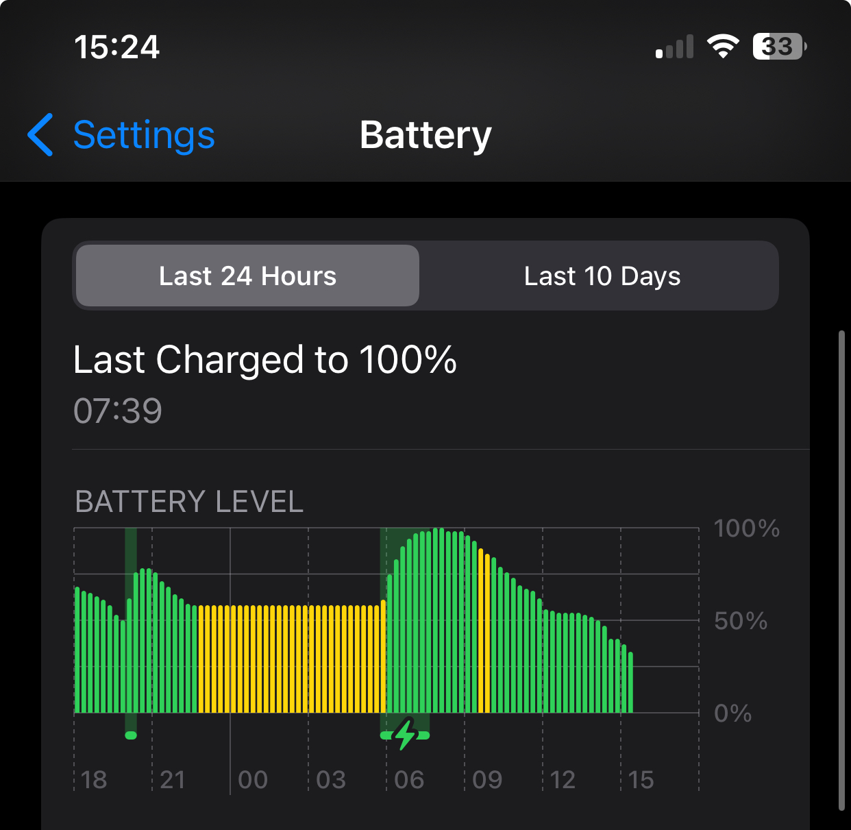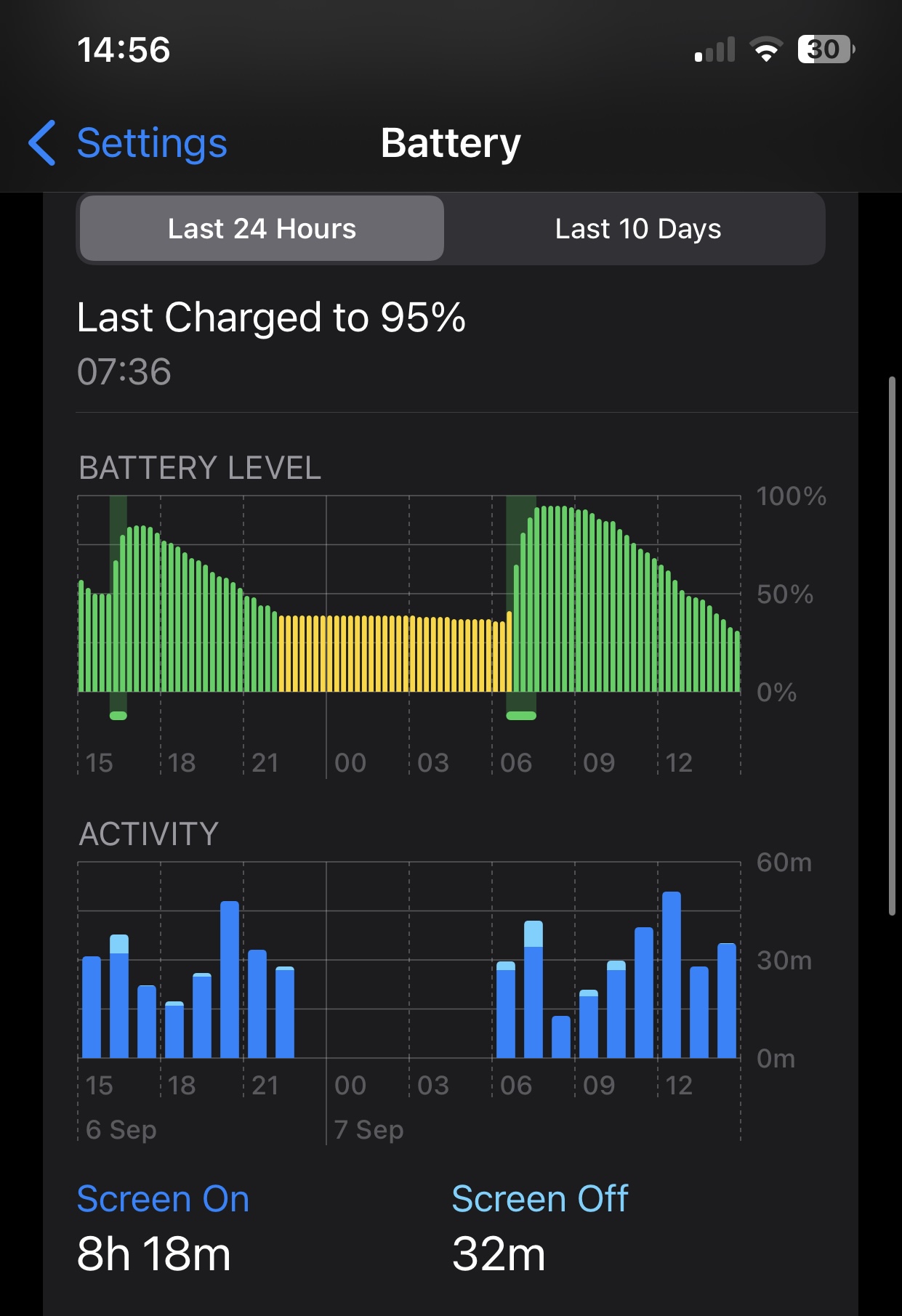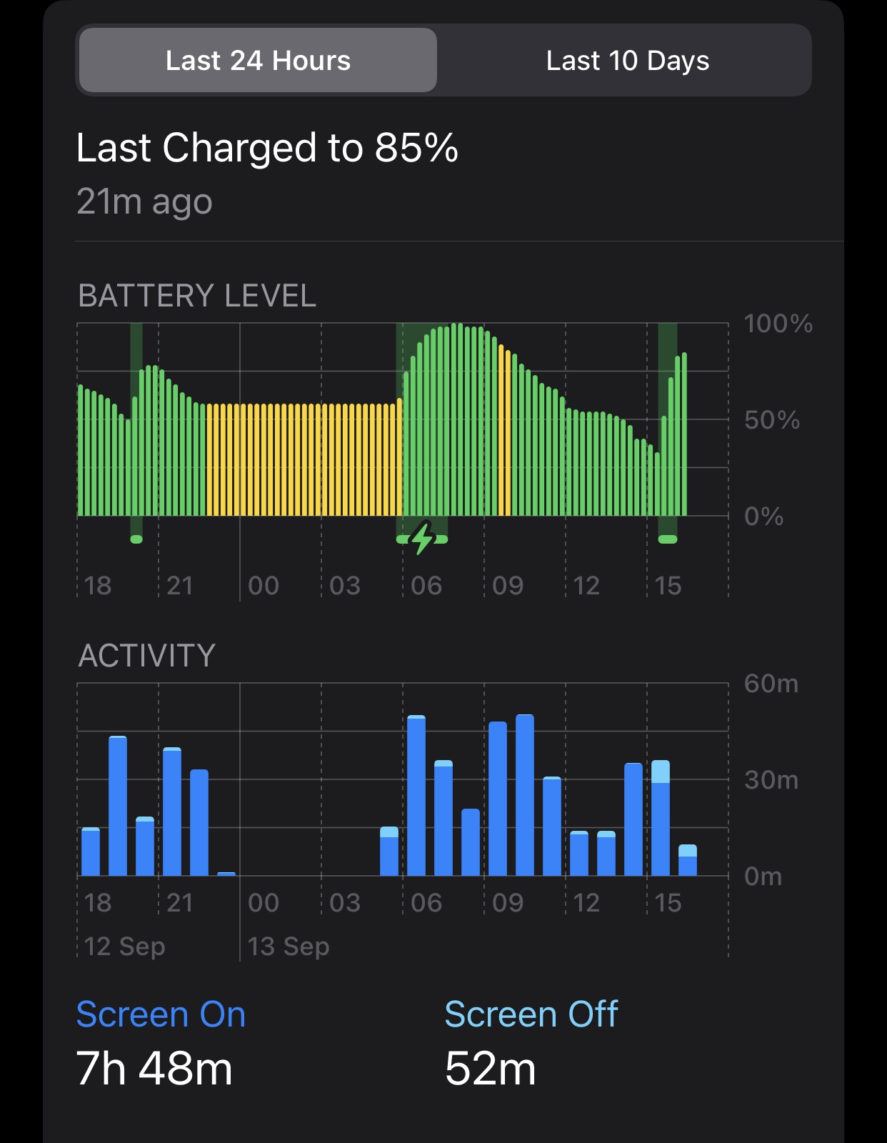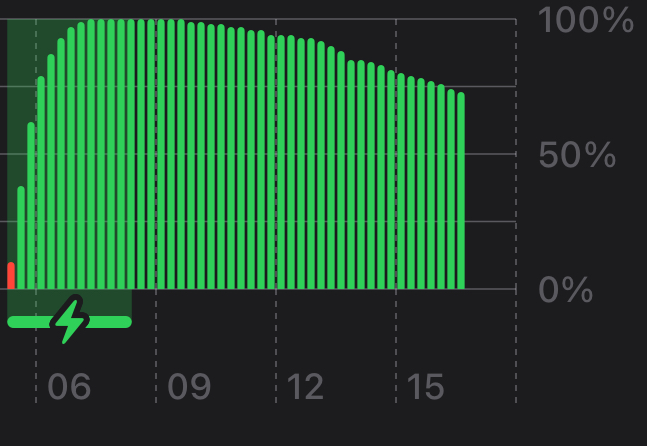 11PM on iOS 17 RC, had to put it on charge as going out this evening and 33% isn’t going to be enough lol. Battery health is 81%.