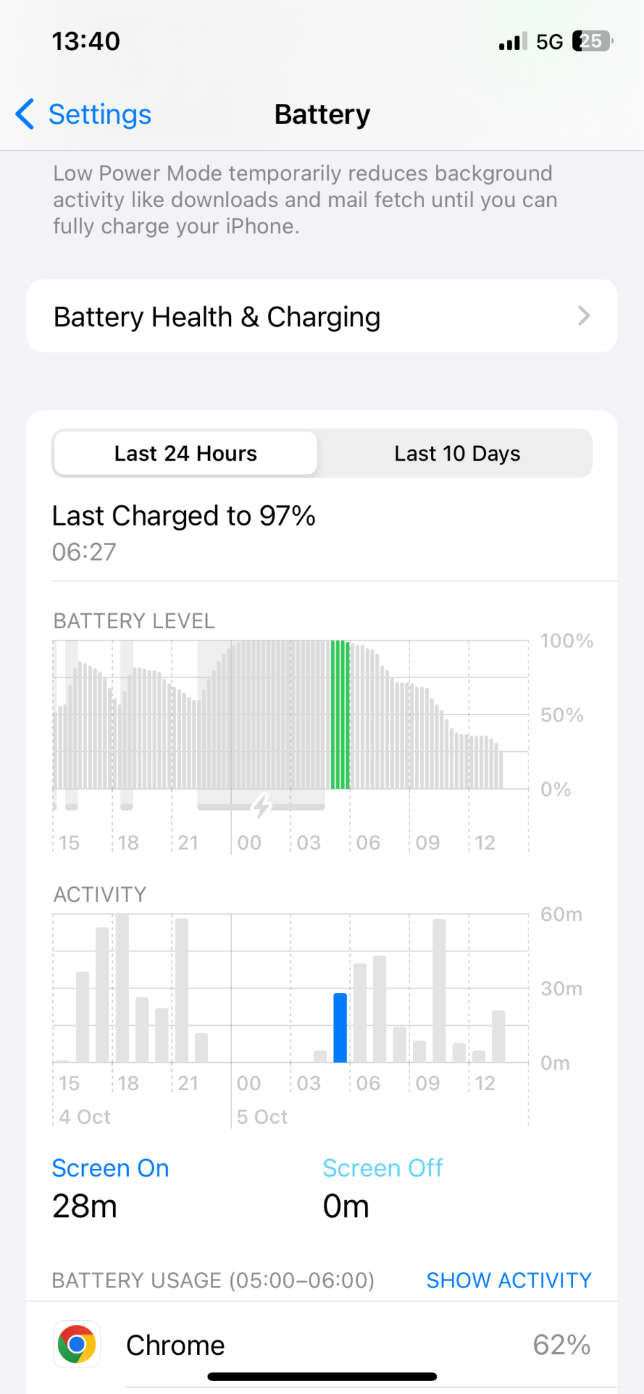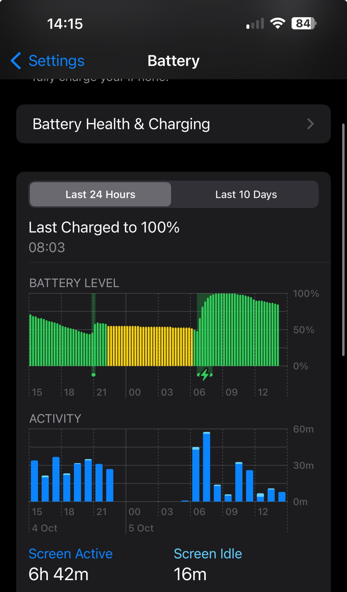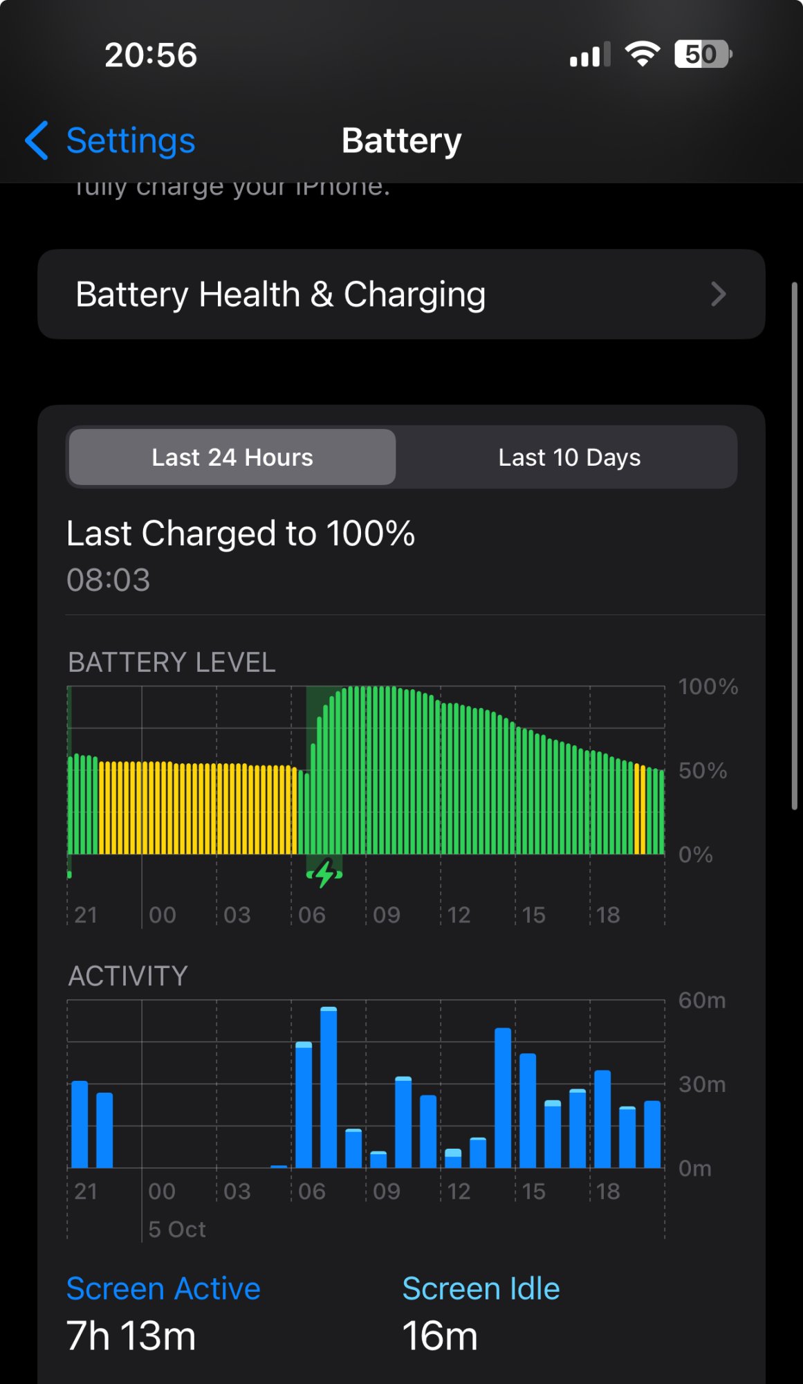 To answer some of your question, iphone will display battery usage over last 24h or 10 days and not since last charged. Screen off time mean there was activity but screen was off, example been on call ect., that's my understanding. To get your hours and min you need to tap on each section of graph in green and add min manually unless the beginning of your graph is 100% charged. I have no idea what is the avarage battery usage on iphone 13 Pro, this will very by user and how they use the device, as longest you happy with it that all it matters. If I use my device a lot iphone does get warm but I had this on all previous ios. Saying that I had once battery charging paused due to iphone temp but device wasn't warm.Hi guys. Firts of all i want to say that reading battery status is very not comfortable on apple devices, it is not clear for me. Am i stupid or something? This 3 hrs colums are so hard to read... Can i somehow get more clear info?