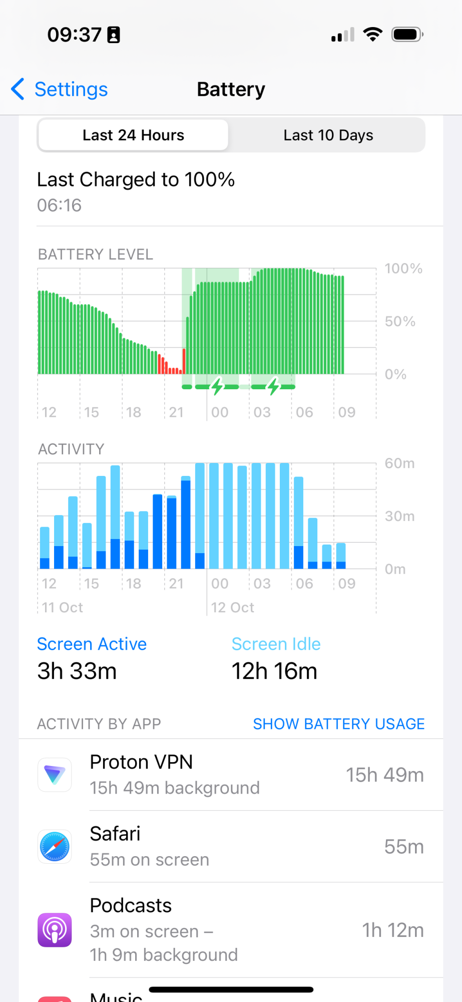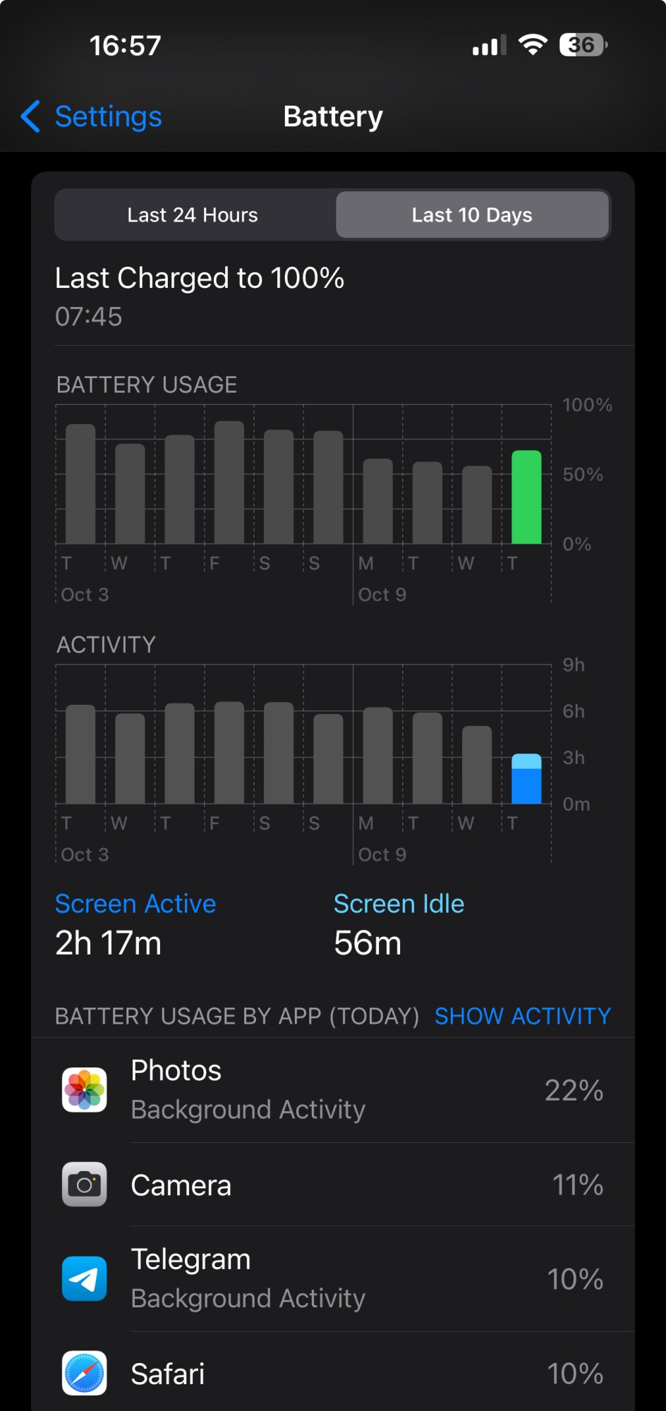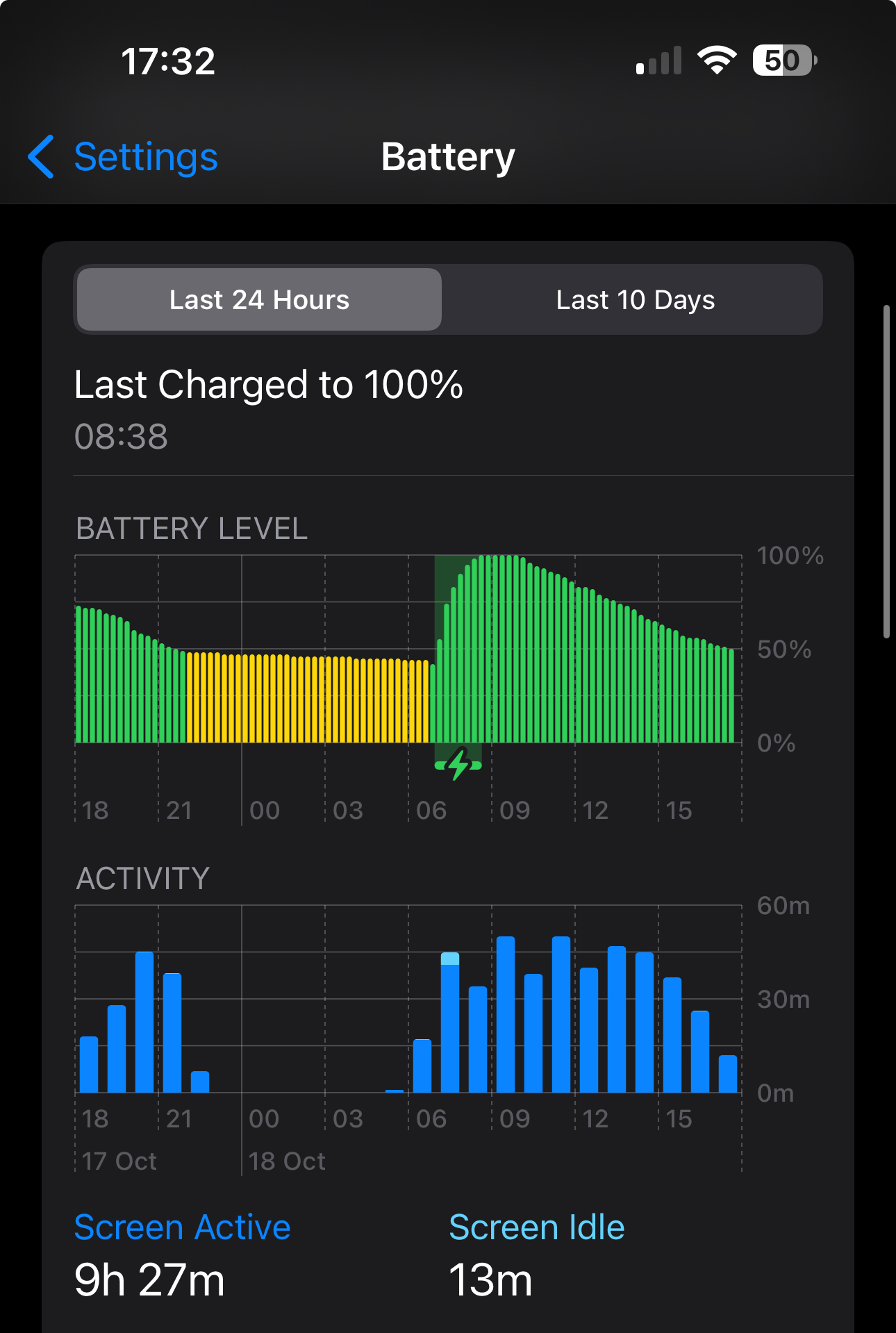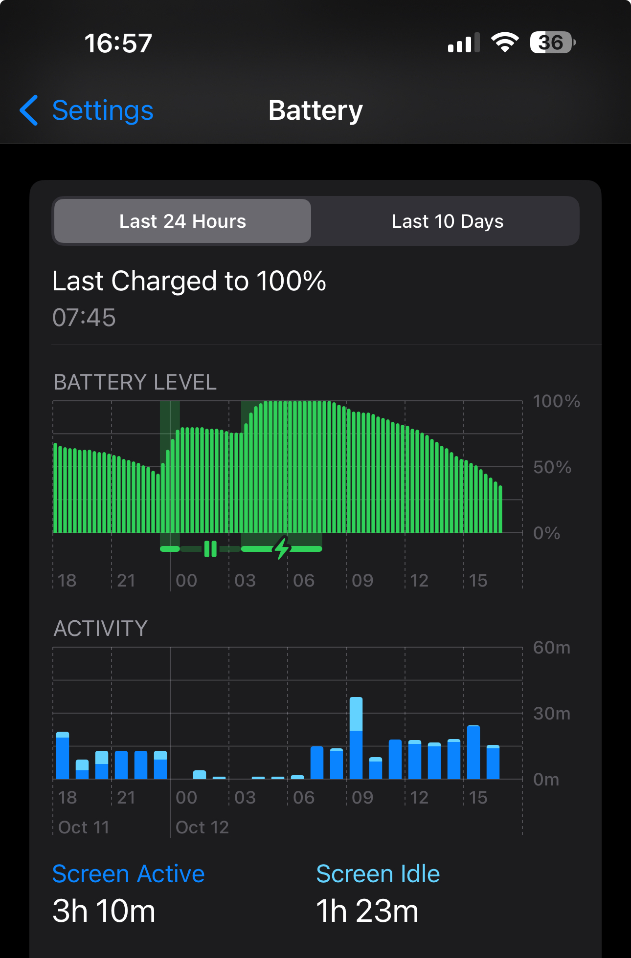 Above: iOS 17 before reset: went down to about 60% in 12 hours (9pm to 9am) of almost no use.