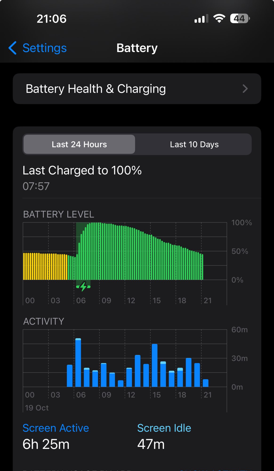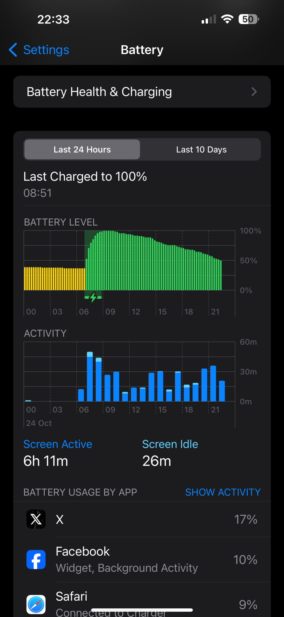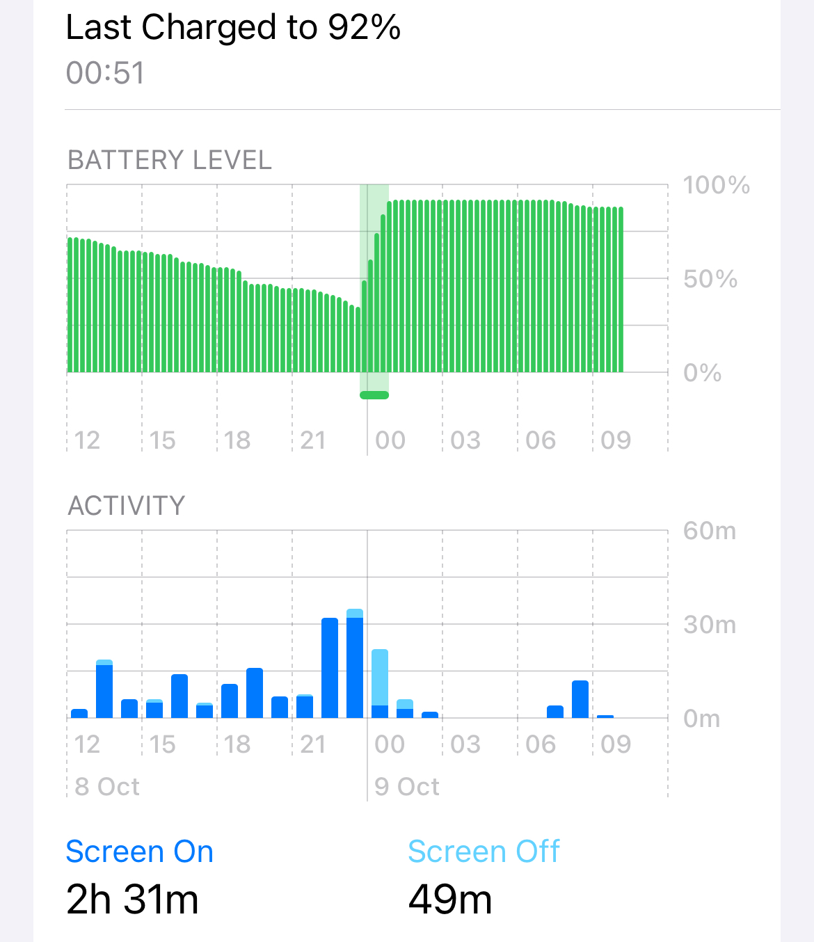 Happy with that…. Bedtime and down to 50%, just a quick charge in the morning & good to go.Had a busy day so less screen time, light to moderate use.