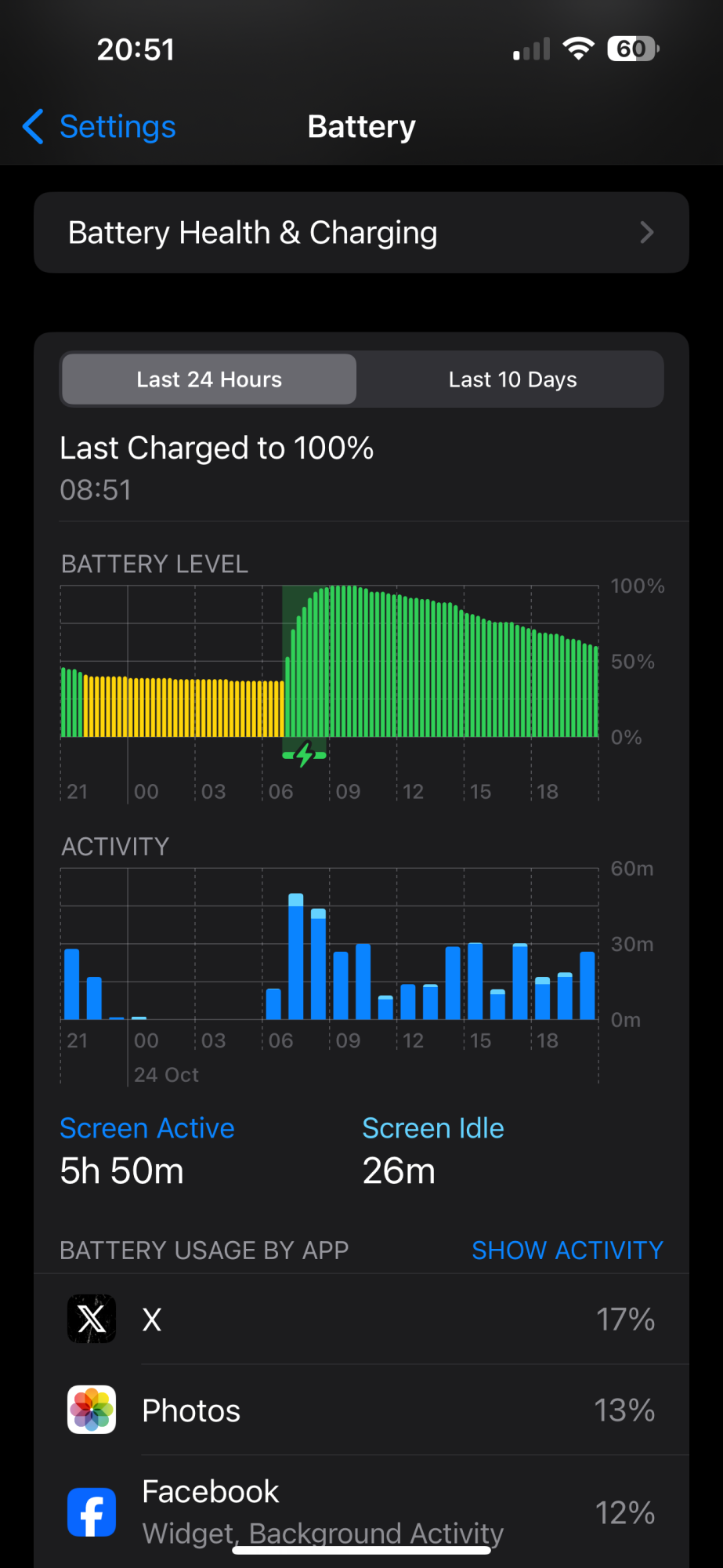 Above: iOS 17 after reset, battery went down to 60% after 24 hours of normal use.