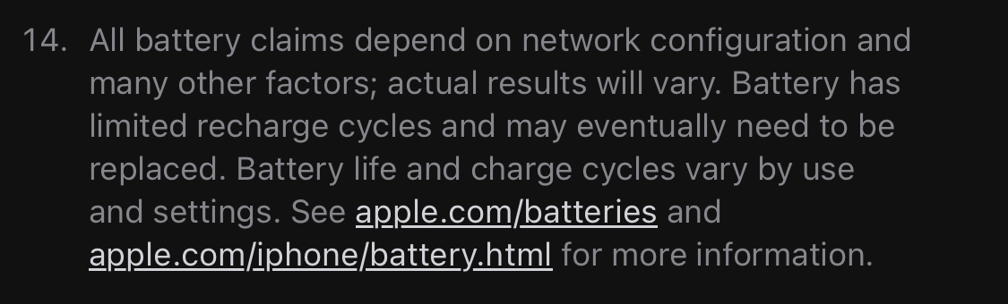 Within the last 13-14 years of owning an iPhone. I’ve never received such stats as Apple quotes on their homepage. Obtaining these battery stats is nearly impossible.